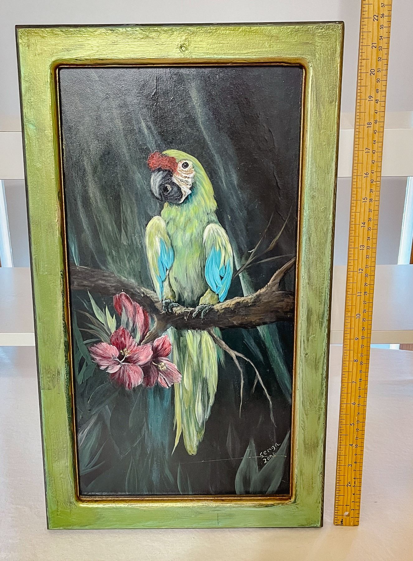 Signed by artist and dated - Artist: “Senga”. Vivid colors, green frame. Scratch at bottom as shown. Approx. 12.5”W x 22”H with frame.
