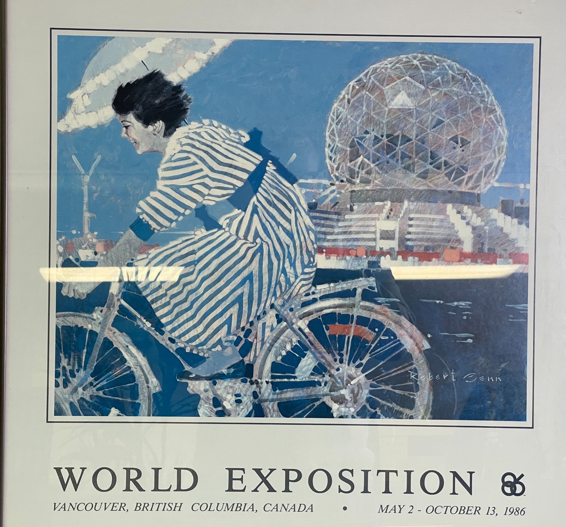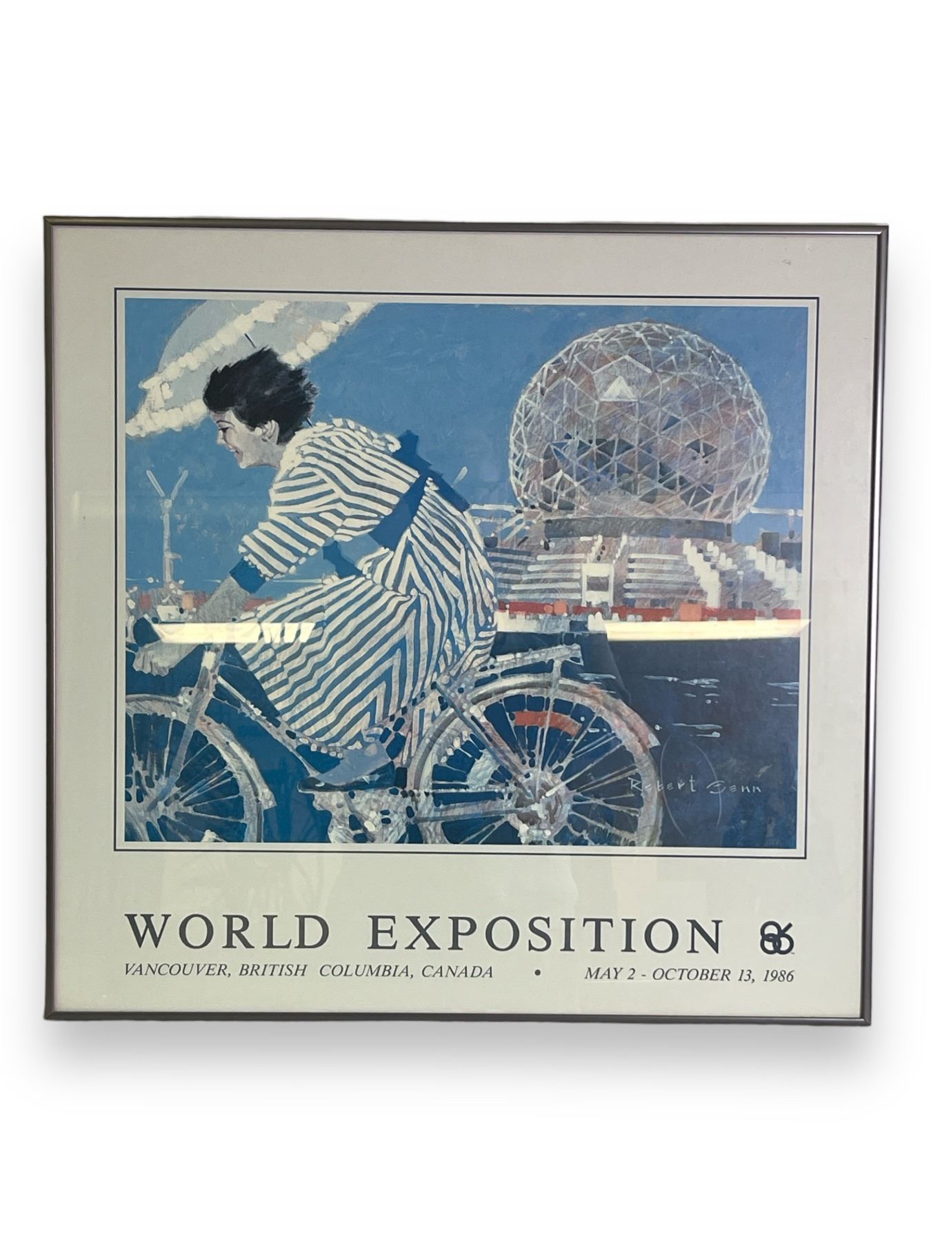 Framed World Exposition Vancouver, British Columbia, Canada May 2 - October 13, 1986 poster signed by Canadian artist Robert Genn - frame approx. 25 1/2in x 24 1/2in art auction