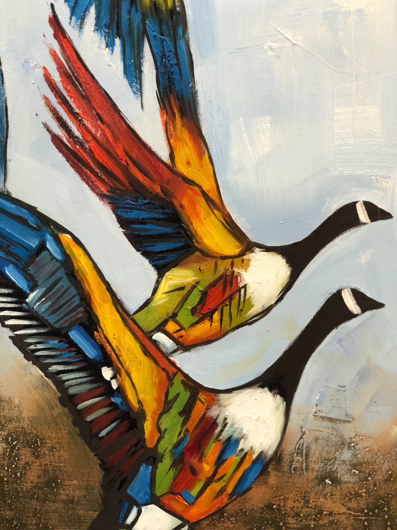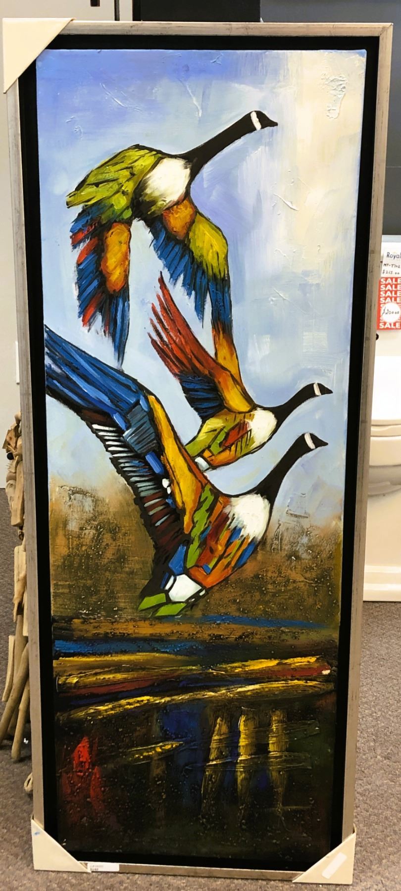Framed birds flying painting on canvas (approx. 17.5 x 44.5in)