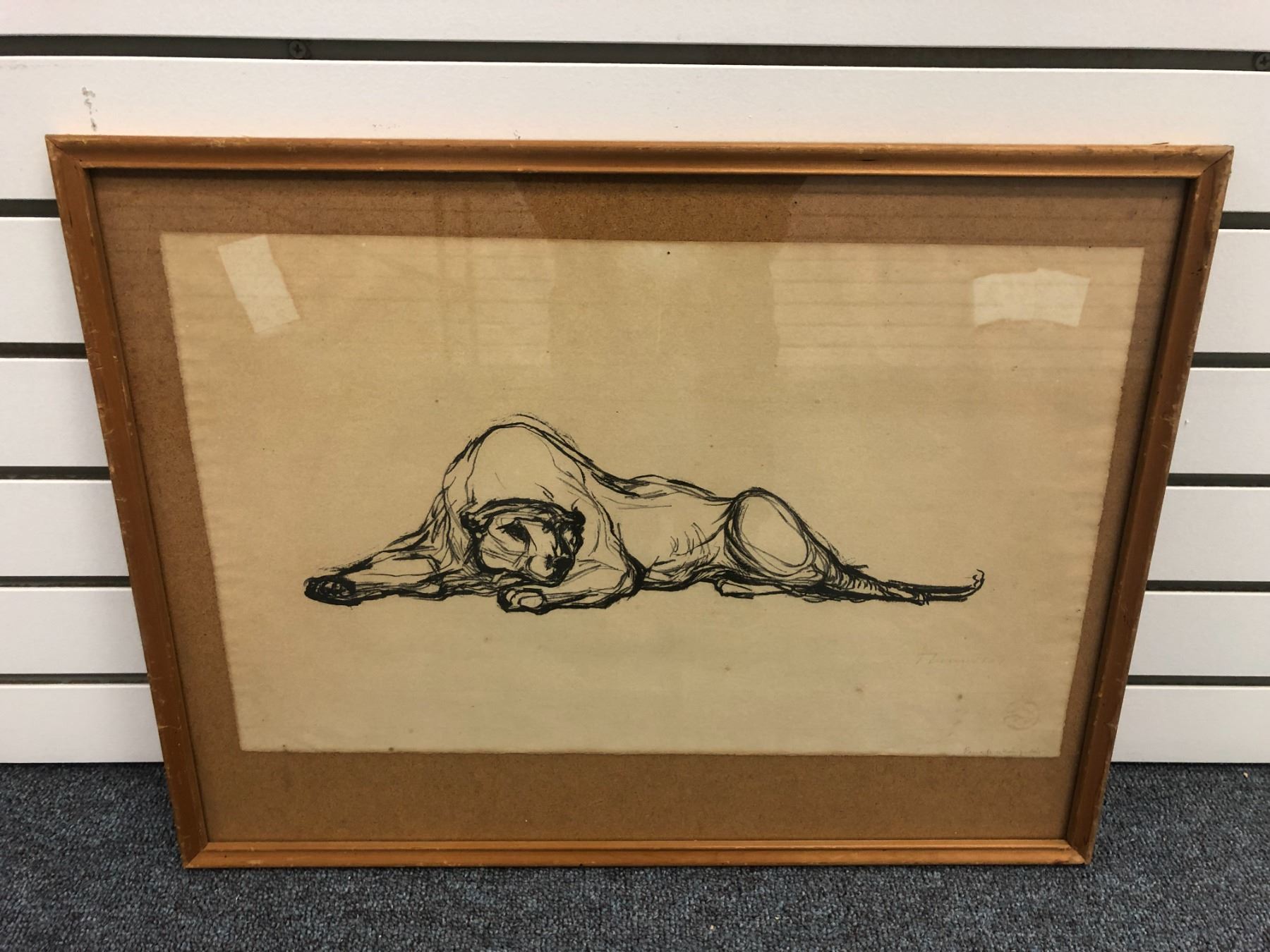 Framed original charcoal pencil sketch drawing "Mountain Lion" signed by artist bottom right corner - approx. 19in x 12in (believed to be of Scandinavian origin)