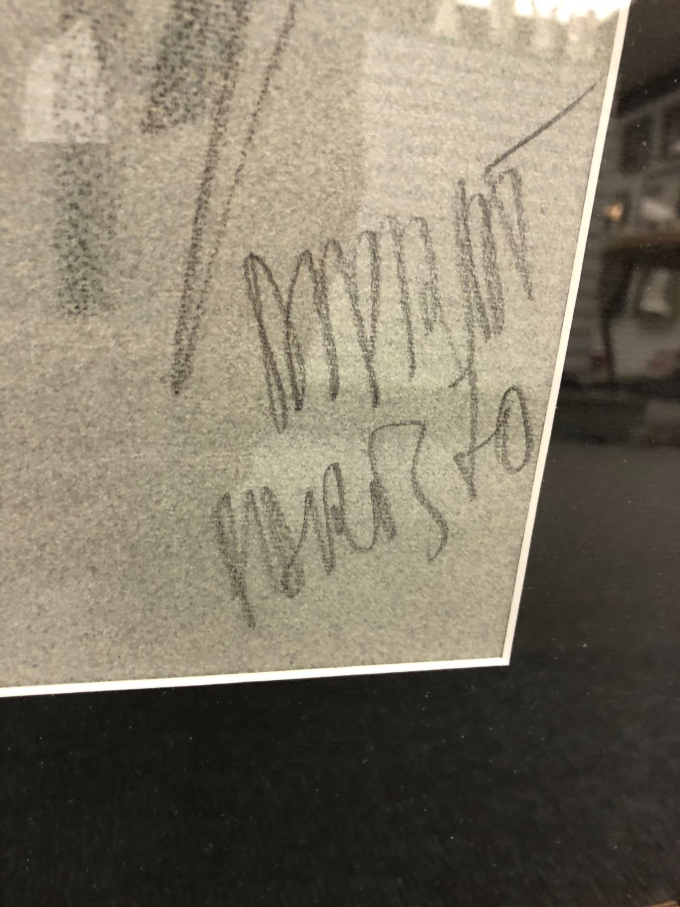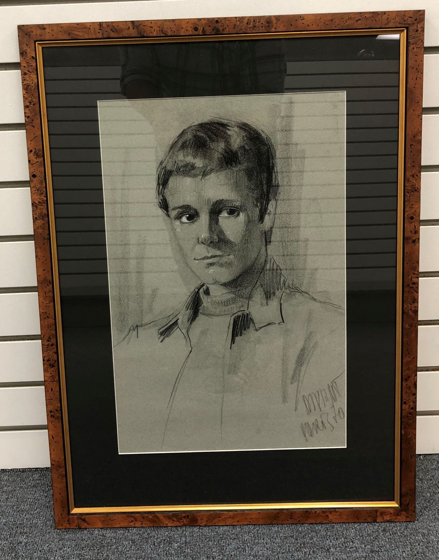 Framed original charcoal pencil sketch drawing, male portrait signed by artist Paris 1970