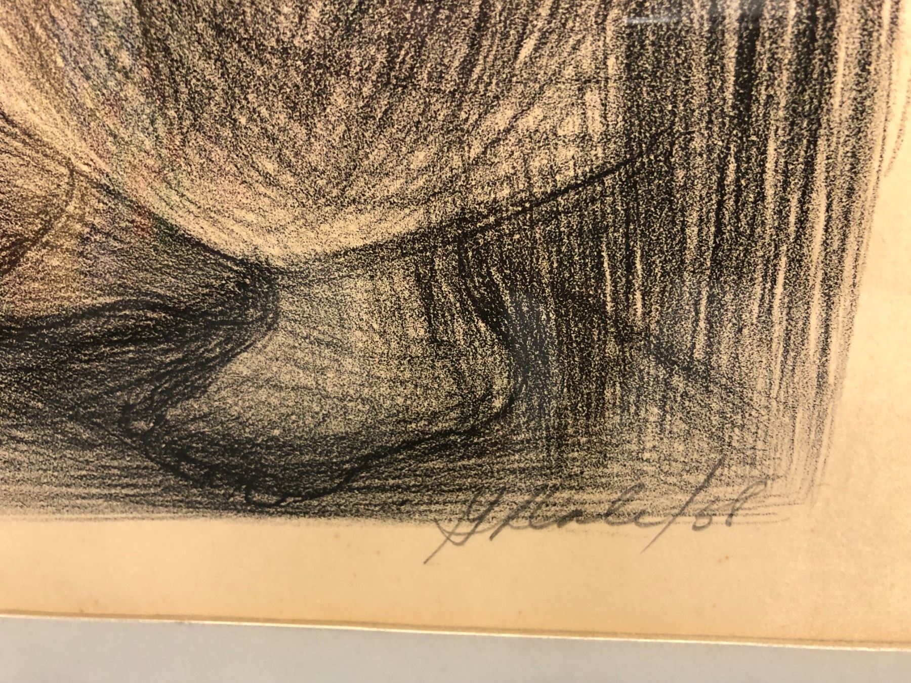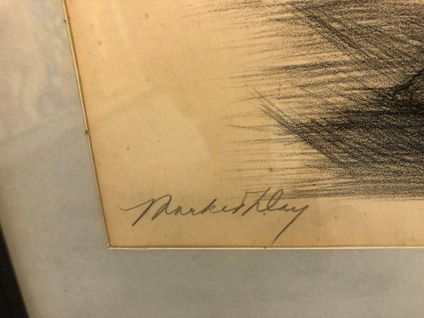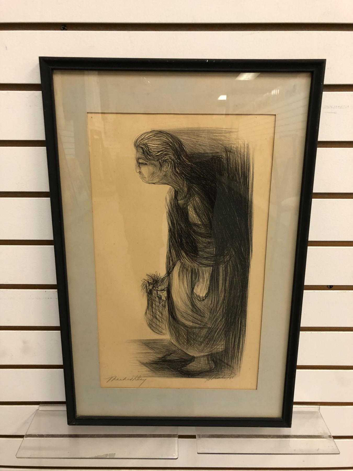 Framed original charcoal pencil sketch drawing titled "Market Day" - signed bottom right corner 1968 approx. 15in x 23in (33)