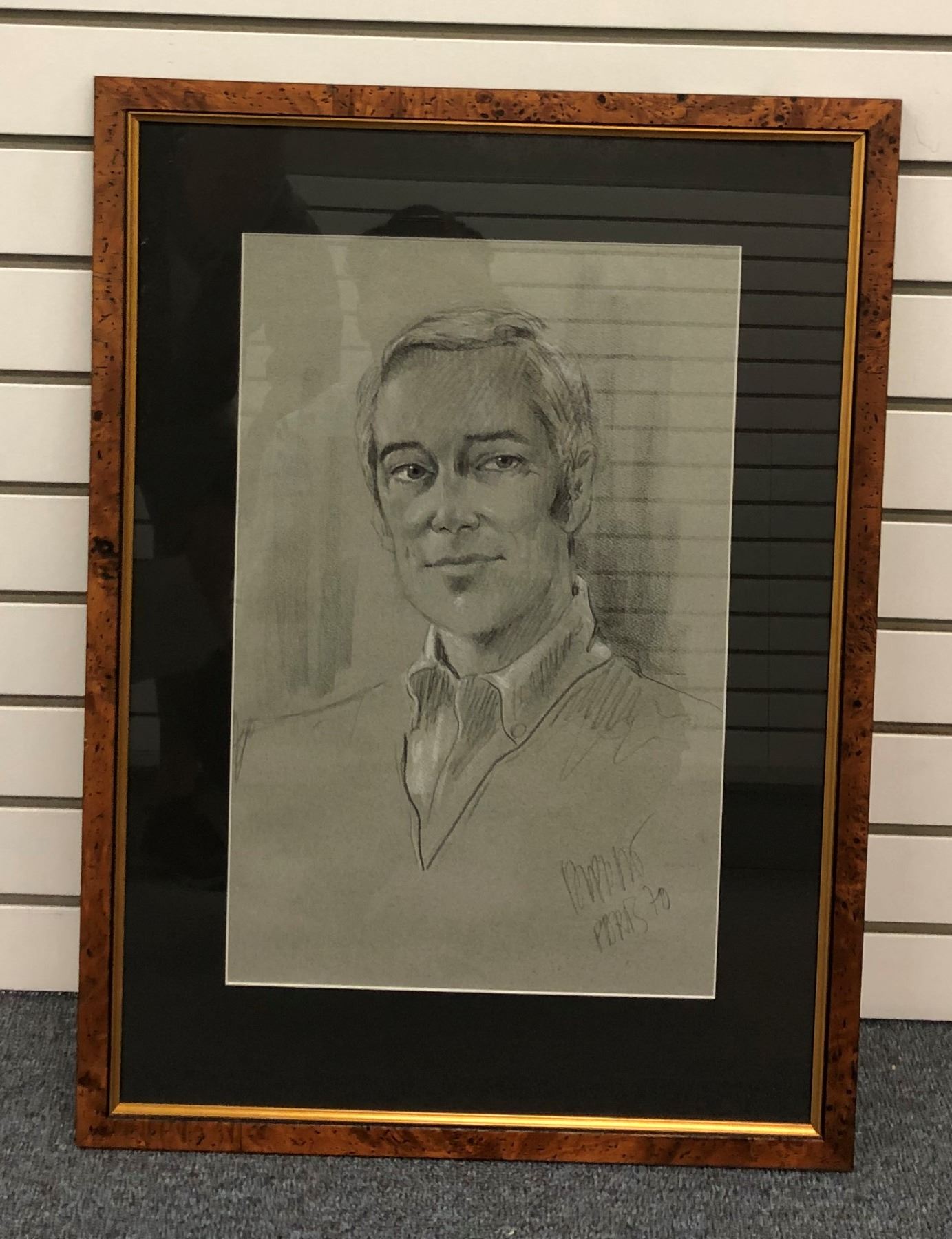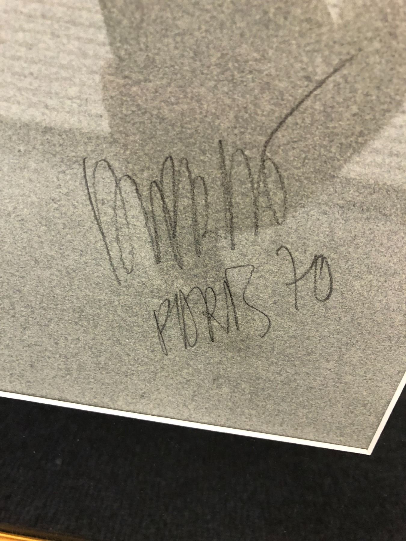 Framed original charcoal pencil sketch portrait of a man signed by artist, Paris 1970 - approx. 12in x 18 1/2in