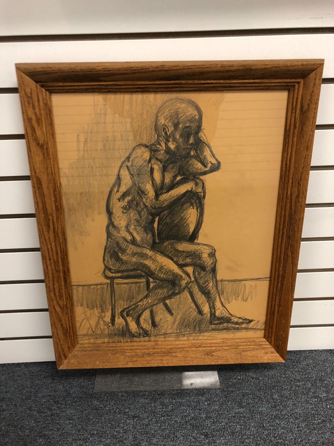 Frank Molnar (1936-2020) - framed nude charcoal pencil sketch drawing signed 1999 - old man sitting on chair - 15 1/2in x 20in