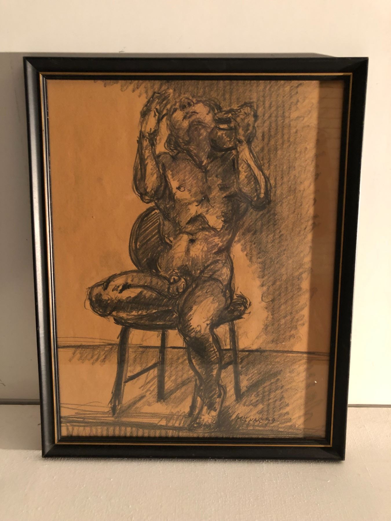 Frank Molnar Canadian (1936 - 2020) - Framed nude charcoal pencil sketch drawing 1999 - seated male approx. 15 1/2in x 19 1/2in