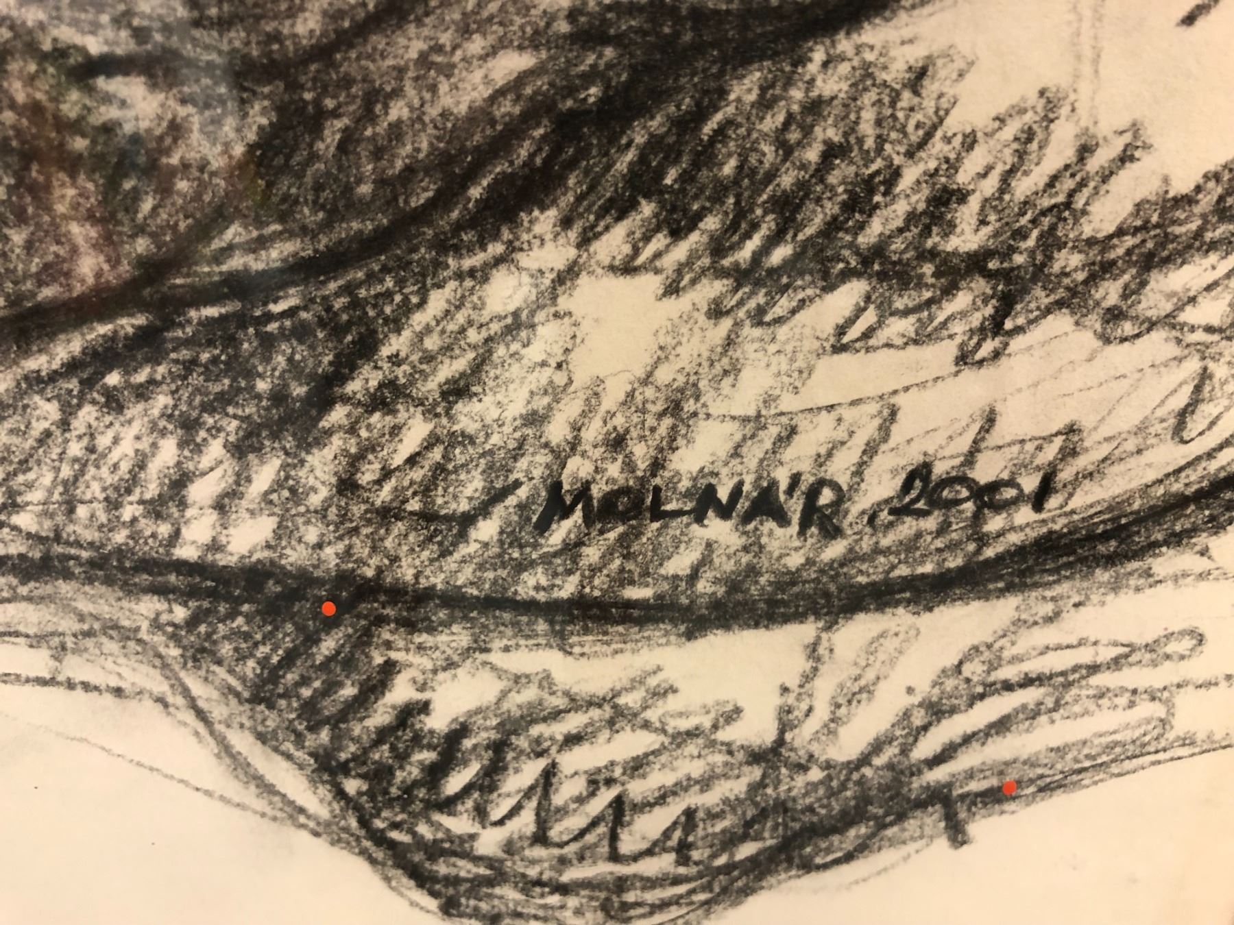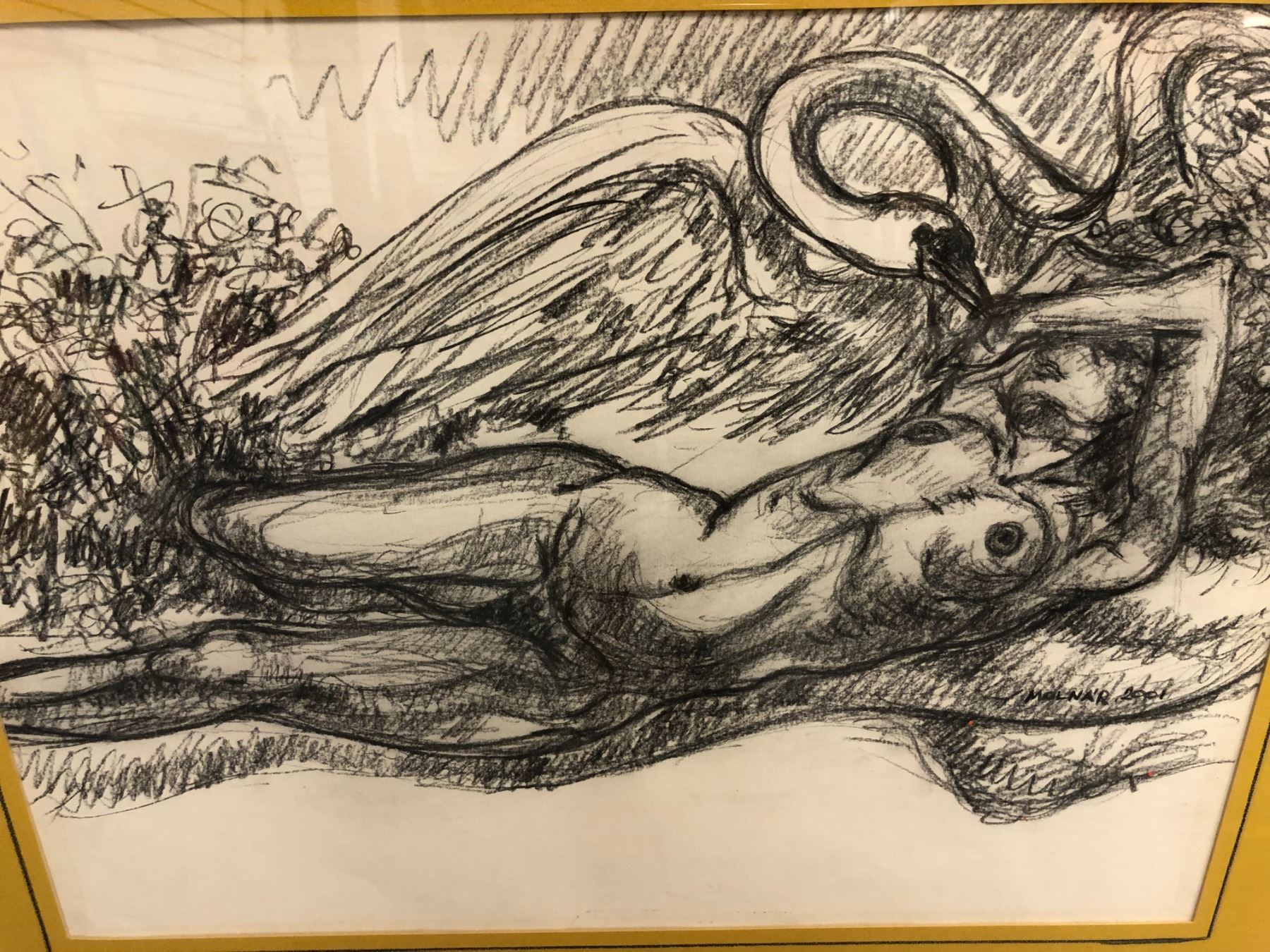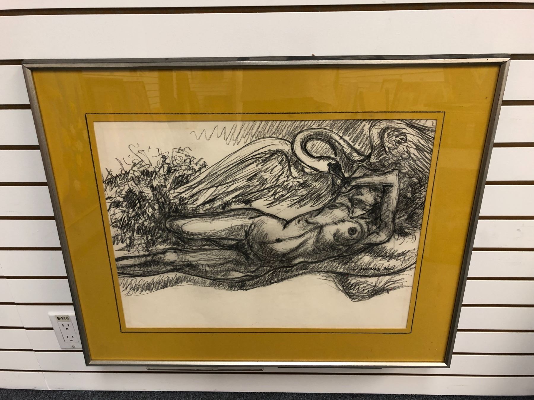 Frank Molnar Canadian (1936-2020) - Framed nude charcoal pencil sketch drawing 2001 - woman w/ swan - approx. 23in x 17in (1)