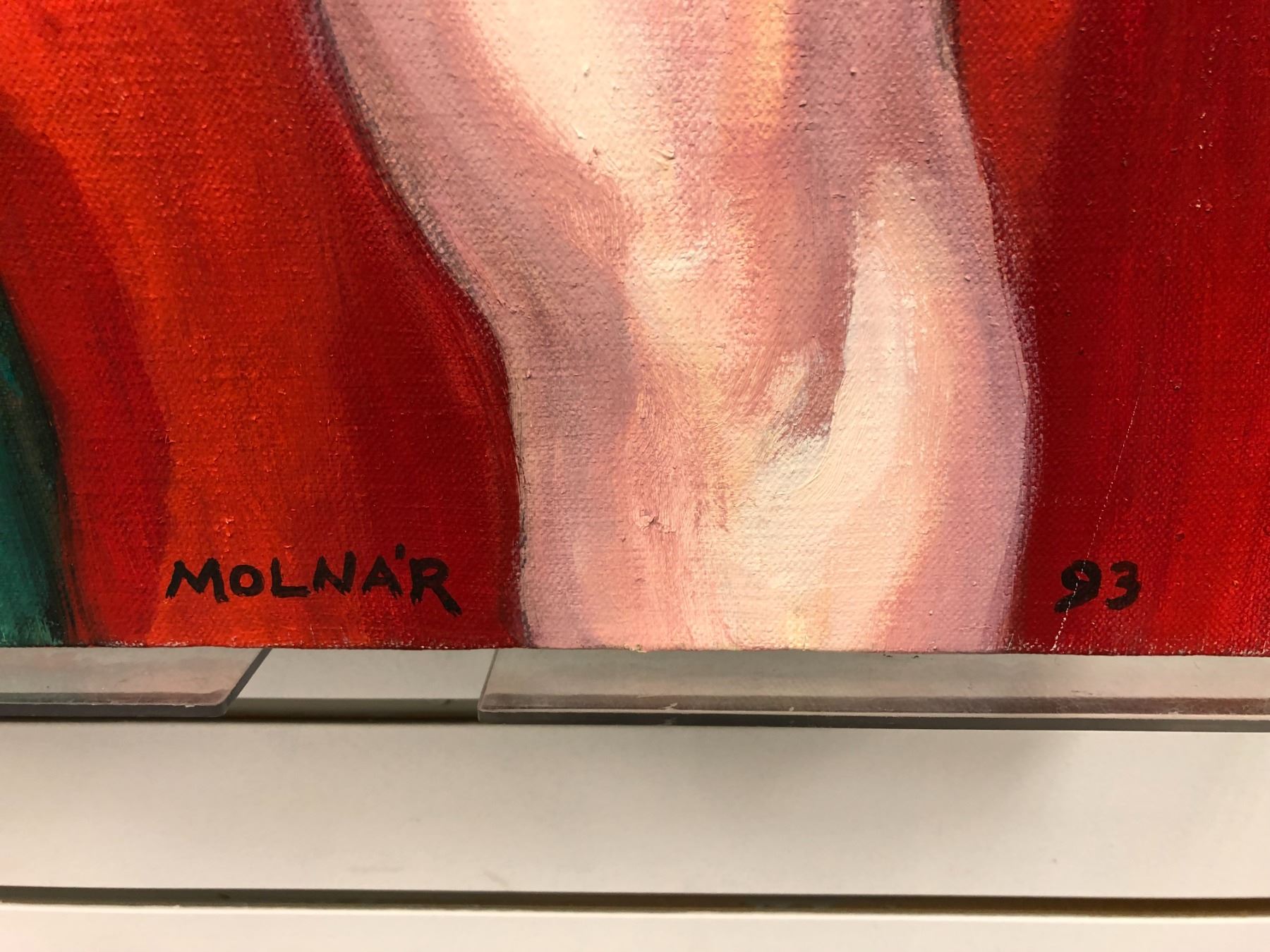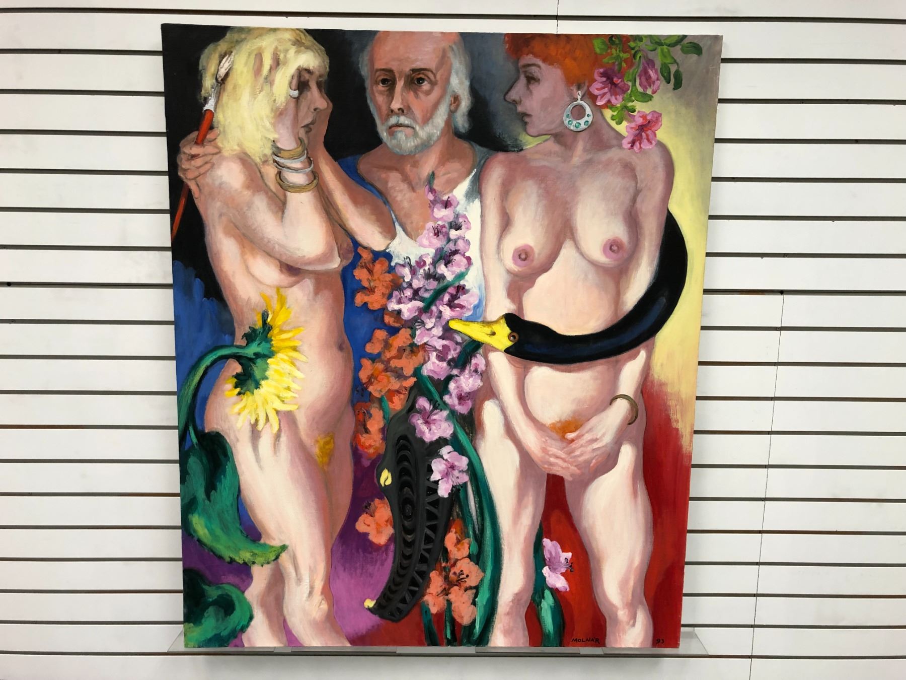 Frank Molnar Canadian (1936 - 2020) - Nude oil on canvas painting 1993 - 2 women w/ artist 42in x 50in (117)