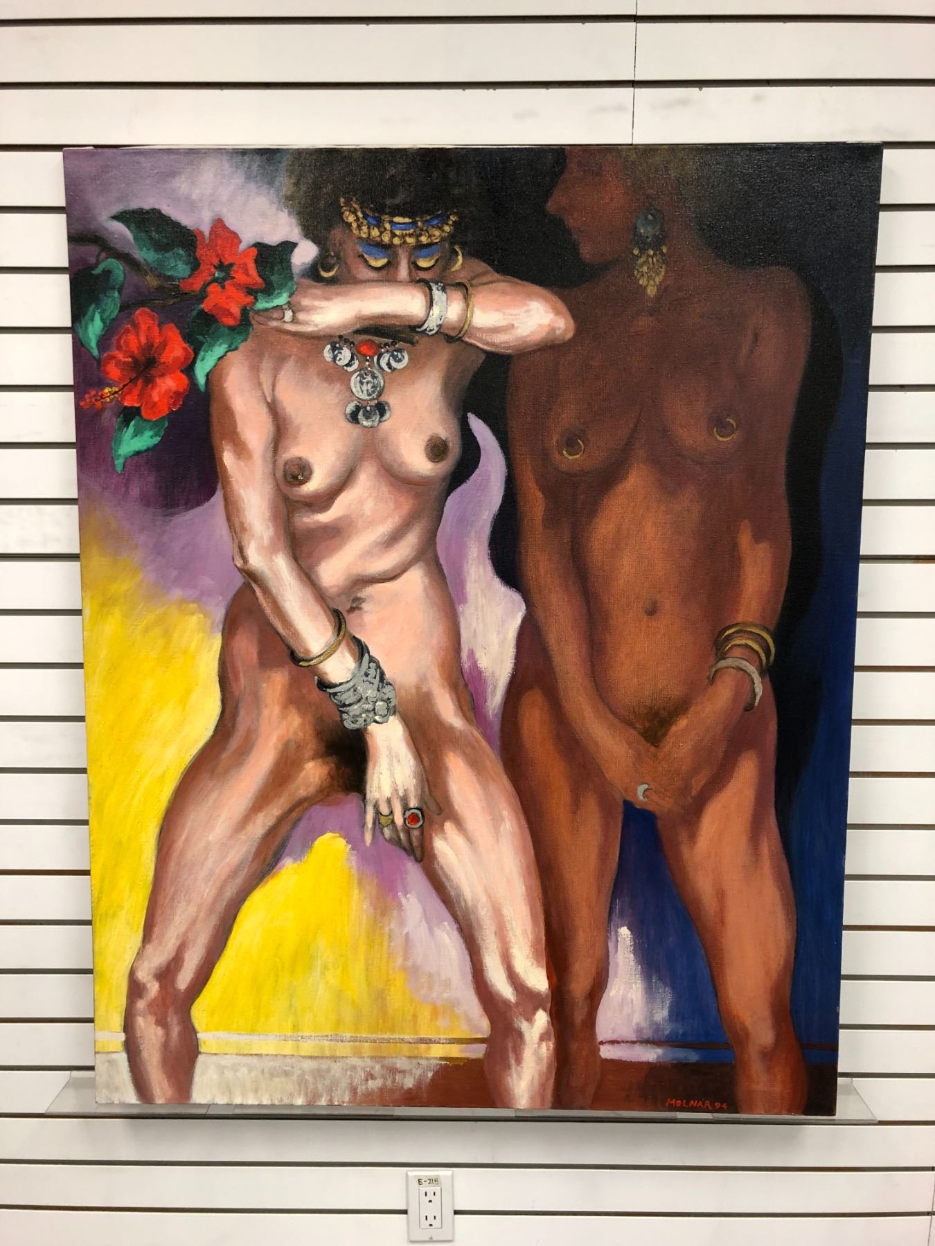 Frank Molnar Canadian (1936 - 2020) - Nude oil on canvas painting 1994 - 2 ladies/ red flowers & jewellery 40 3/4in x 51in (115)
