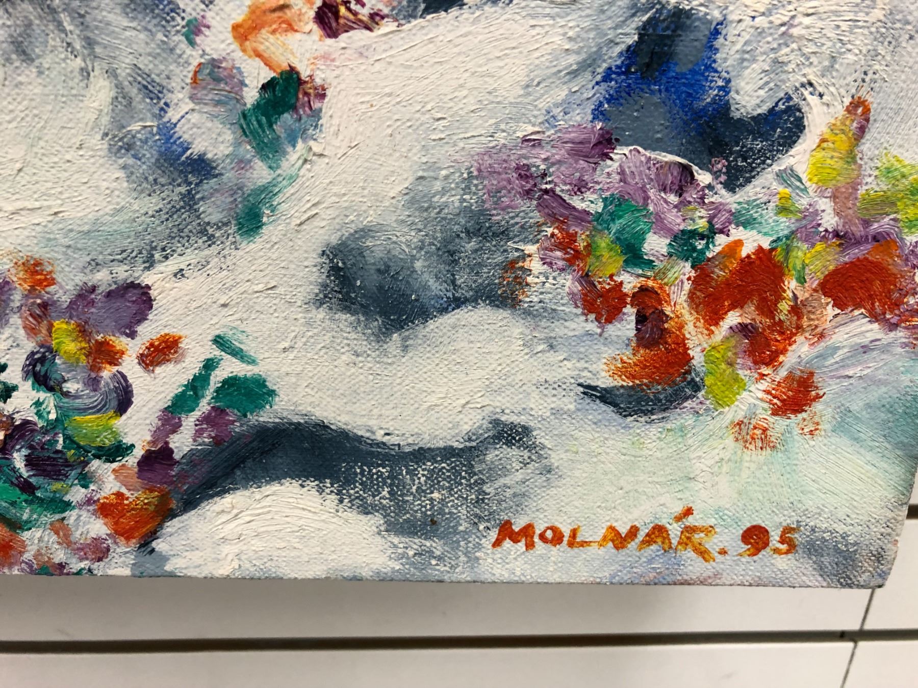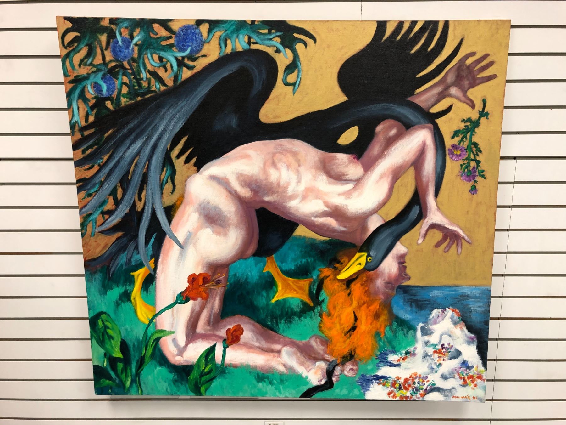 Frank Molnar Canadian (1936 - 2020) - Nude oil on canvas painting 1995 - woman w/ black swan 49 1/2in x 46in (13)