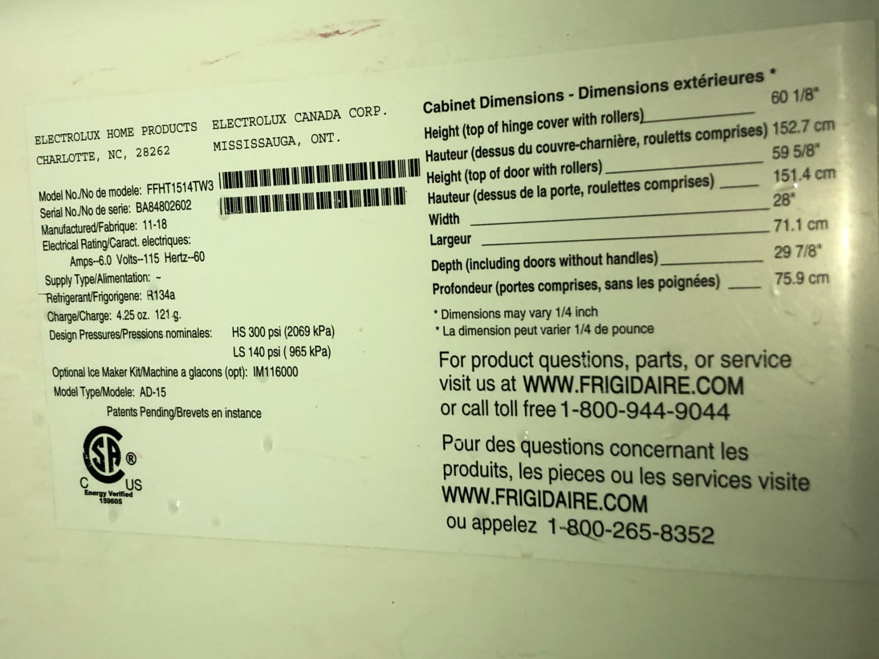Frigidaire fridge model: FFHT1514TW3
