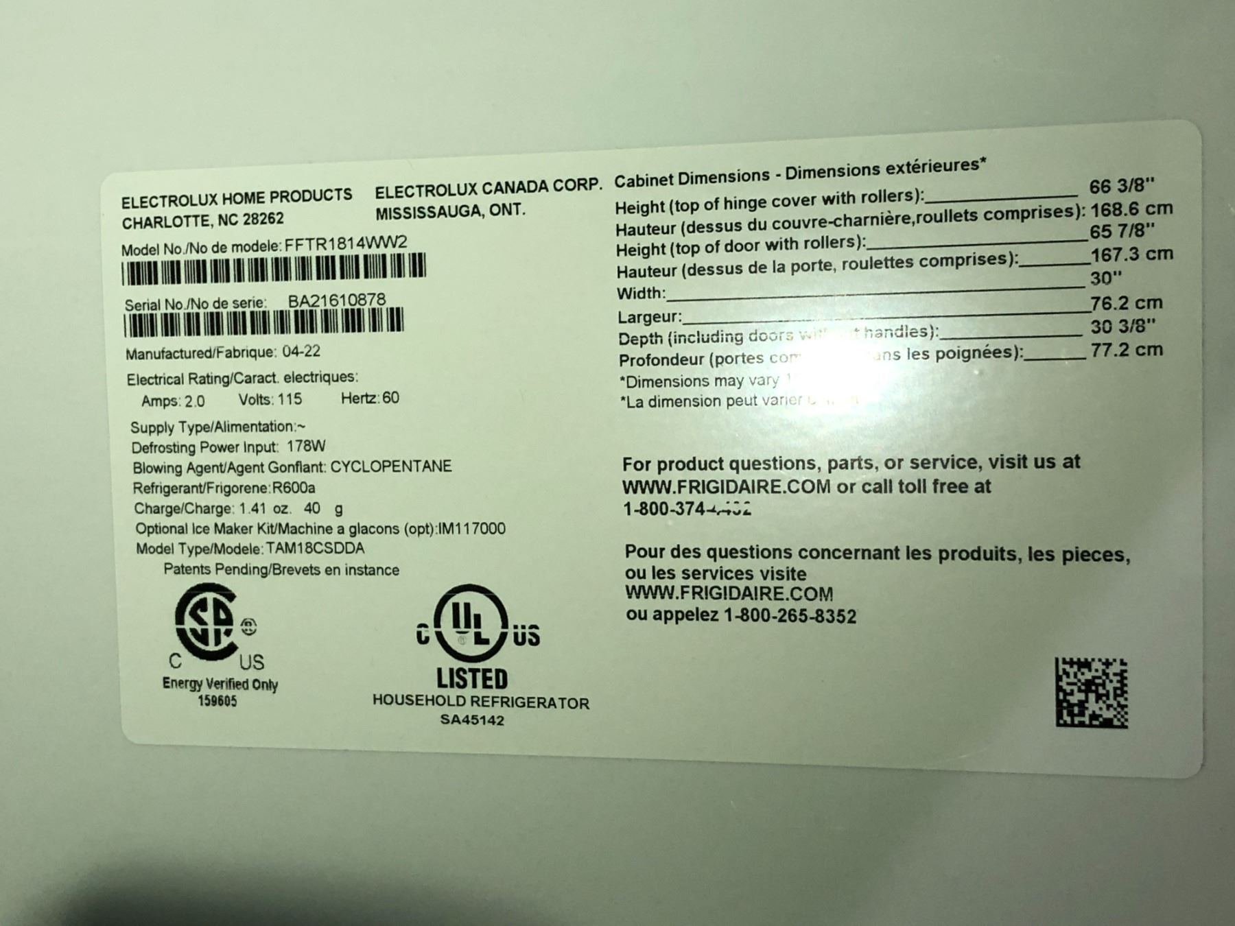 Frigidaire fridge model: FFTR1814WW2