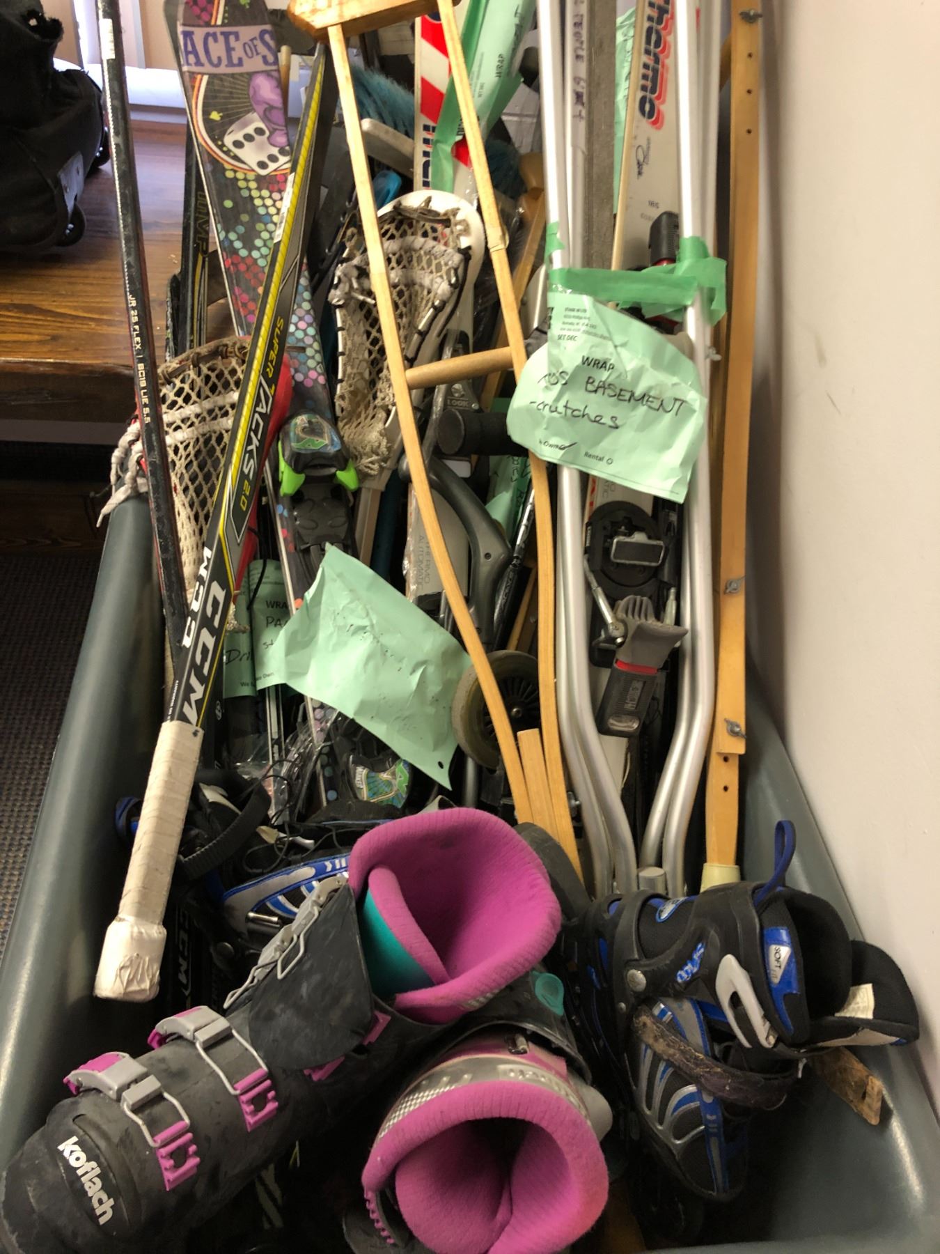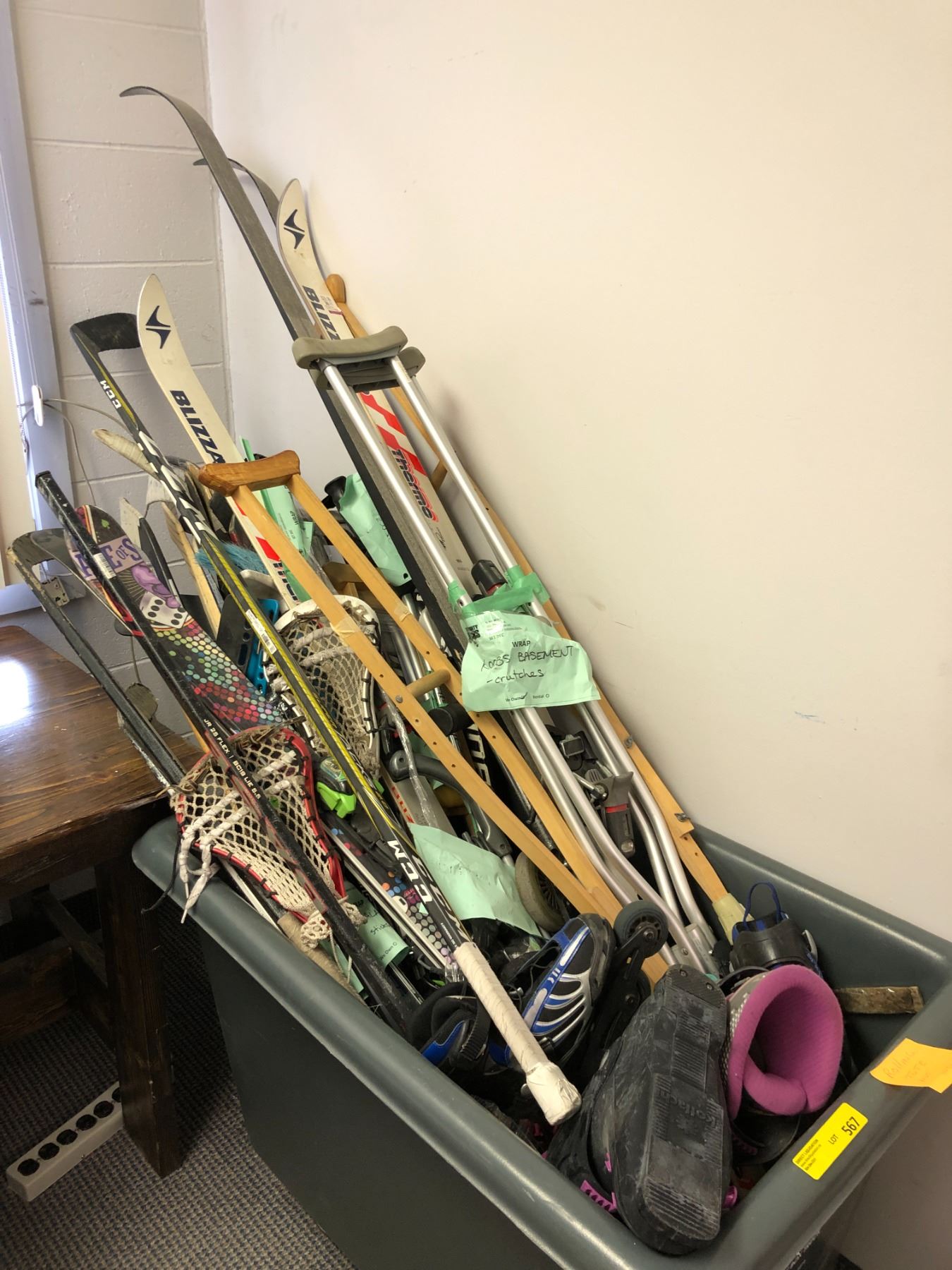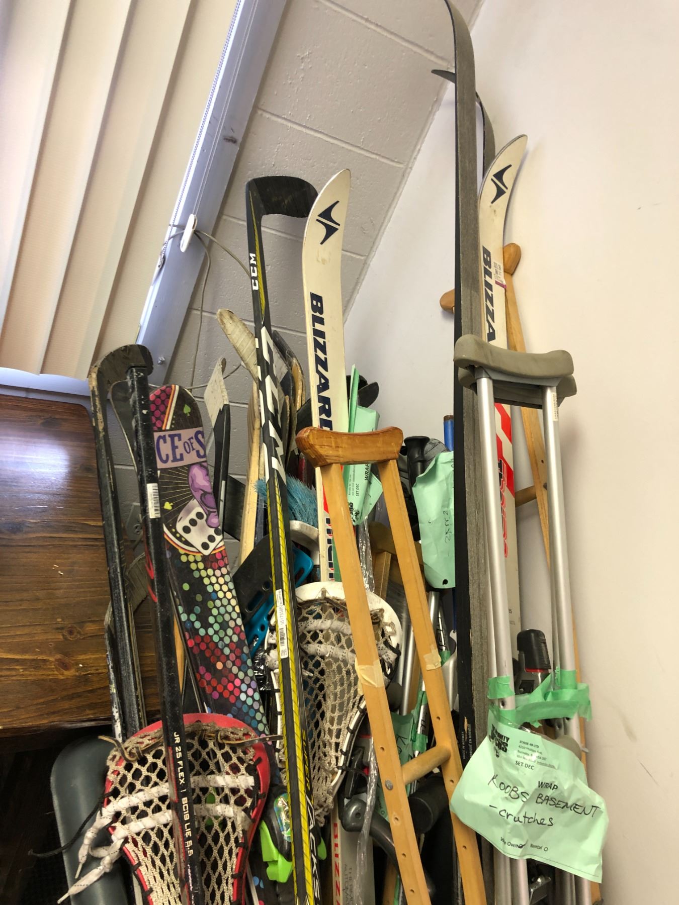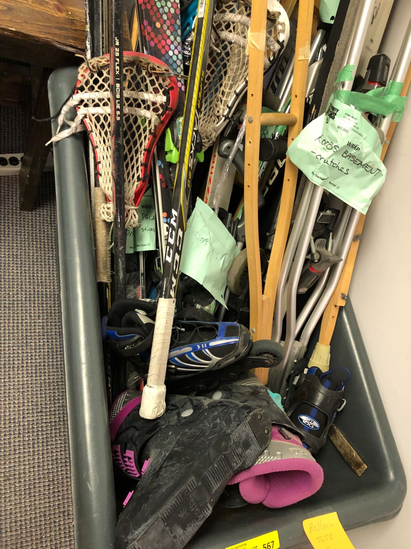 From the Hockey Show - Large Group of Sporting Equipment - Sticks, Lacrosse Sticks, Crutches, Skis and Boots (Bin not included)