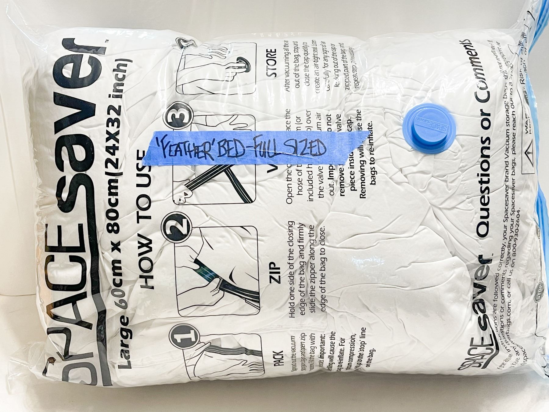 Soft, plush full-sized fiberfill feather bed topper stored in a vacuum-sealed SpaceSaver bag. Clean, odor-free, and in very good condition with no visible wear. Adds comfort and loft to any full bed without the heaviness of down. Ideal for guest rooms, dorms, or cozy winter bedding.