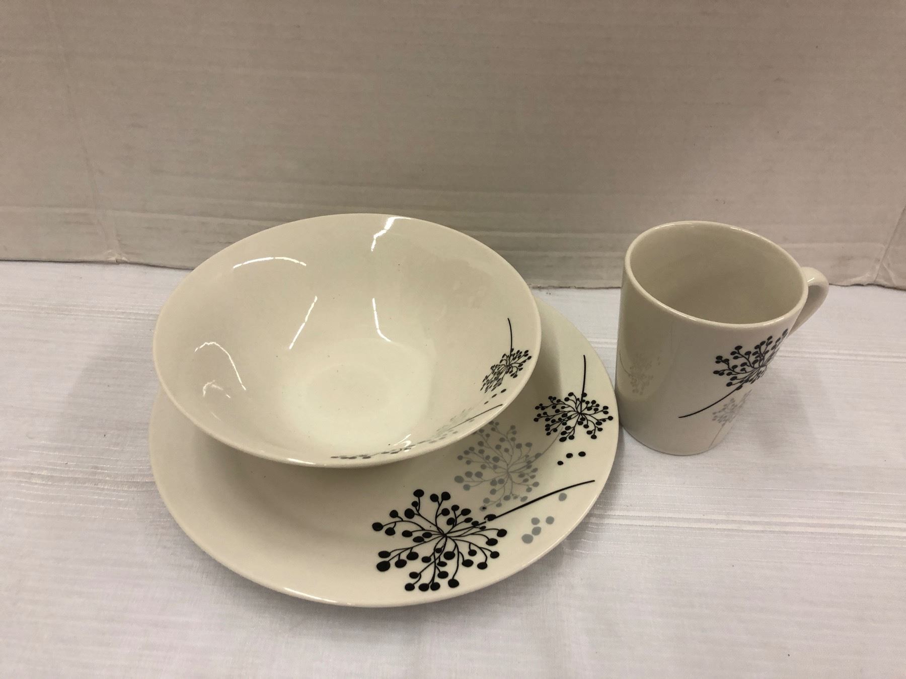 Full white colored with black and grey designed Dinnerware Set, Plates, Mugs, Bowls