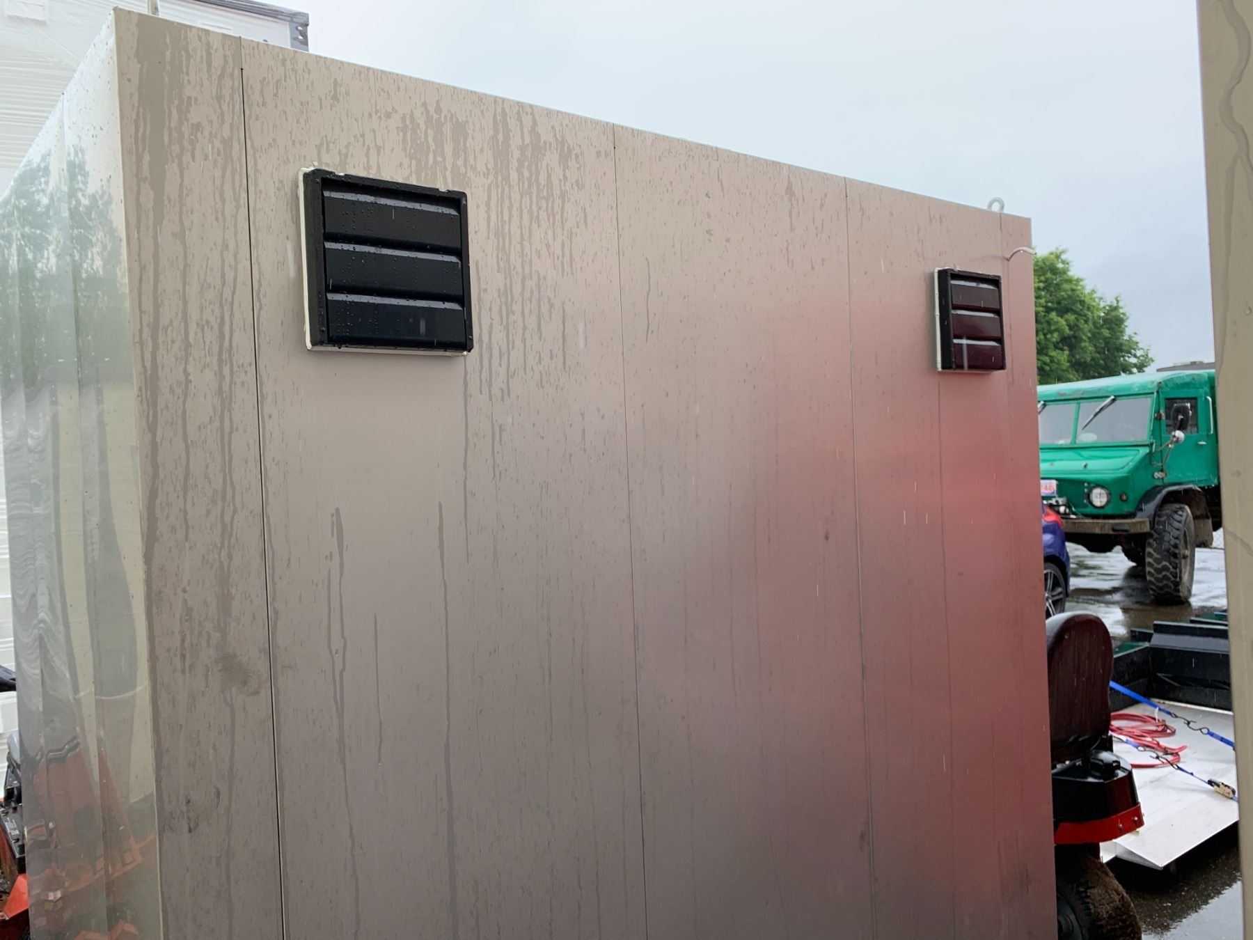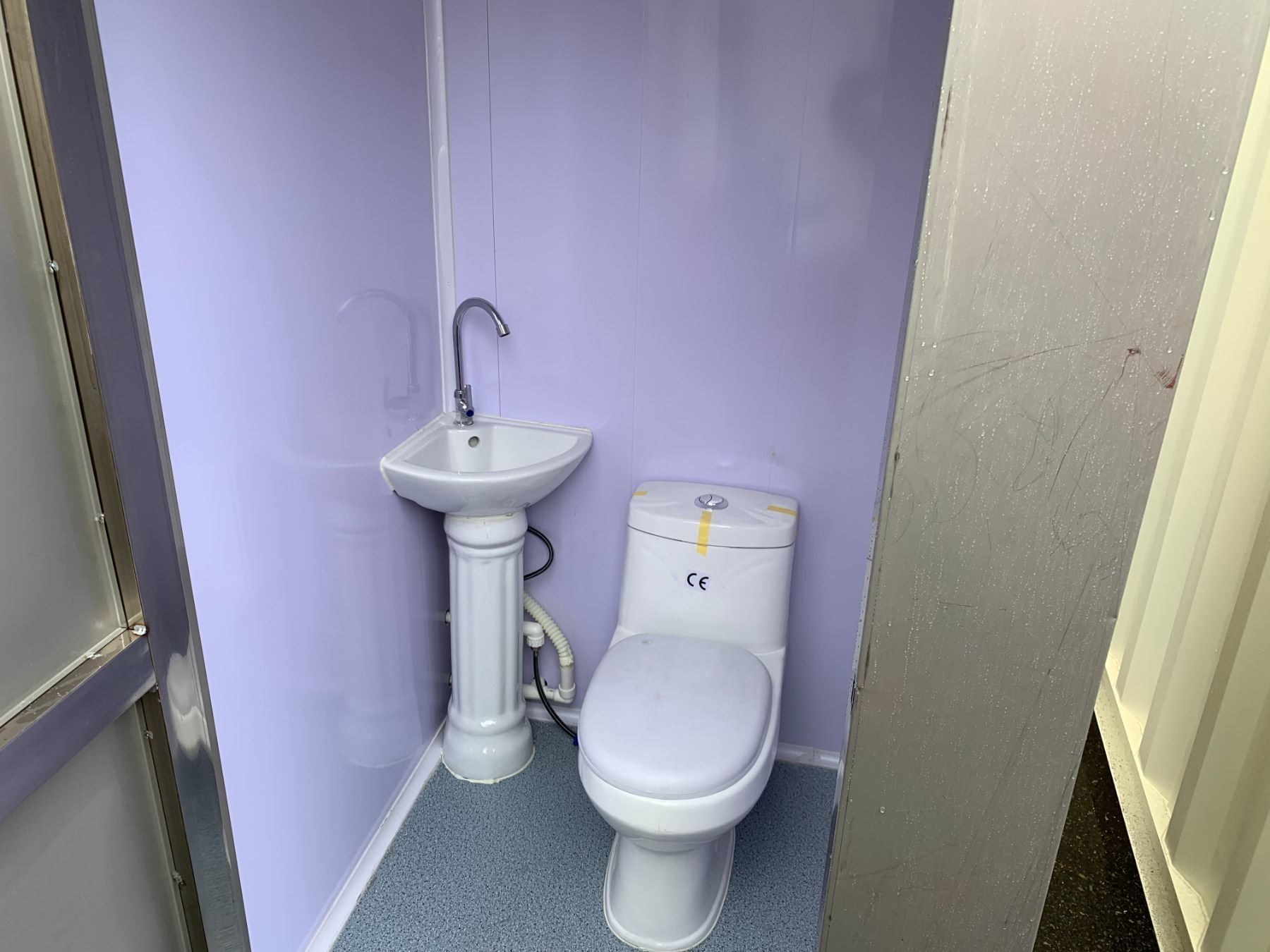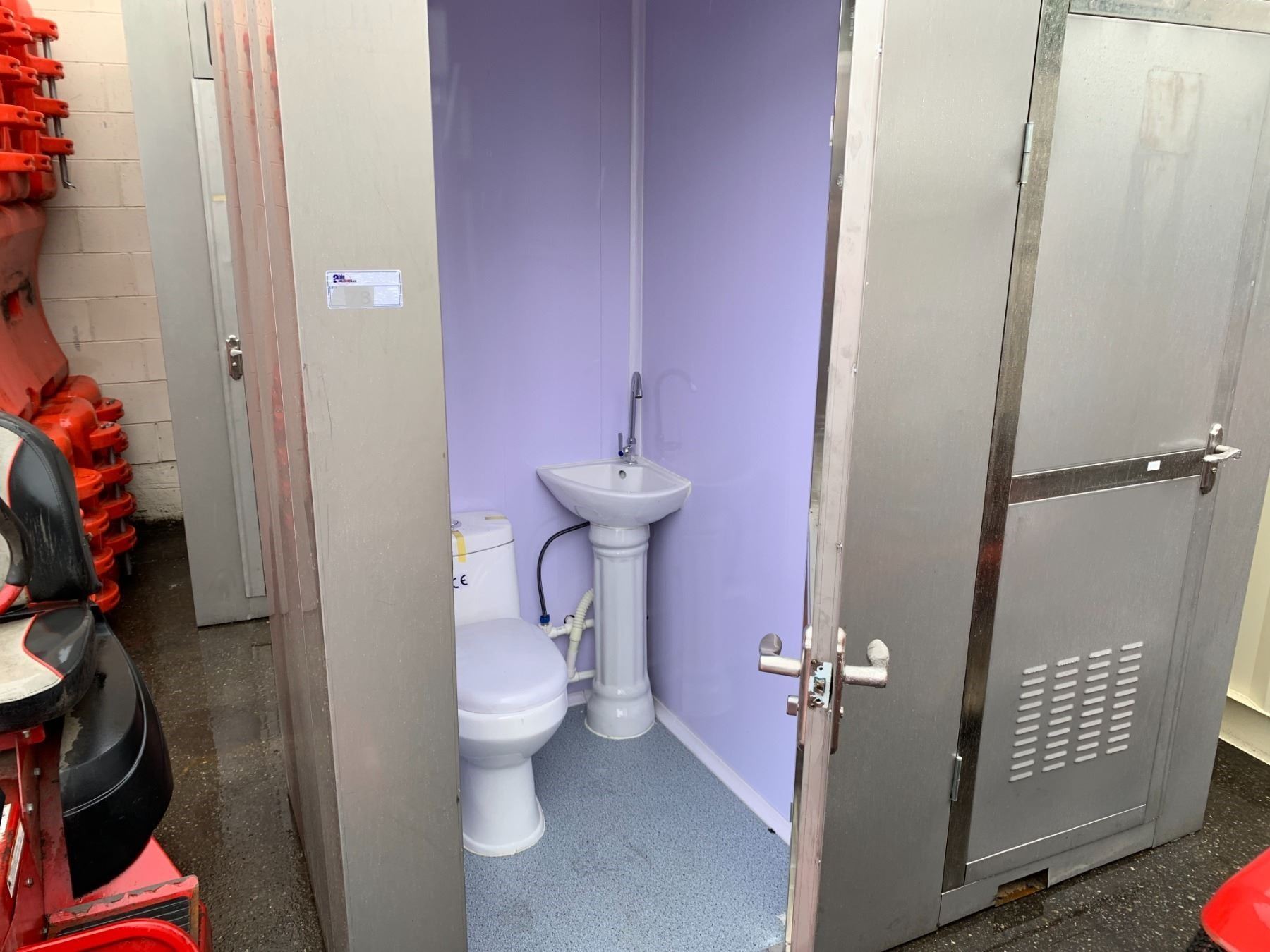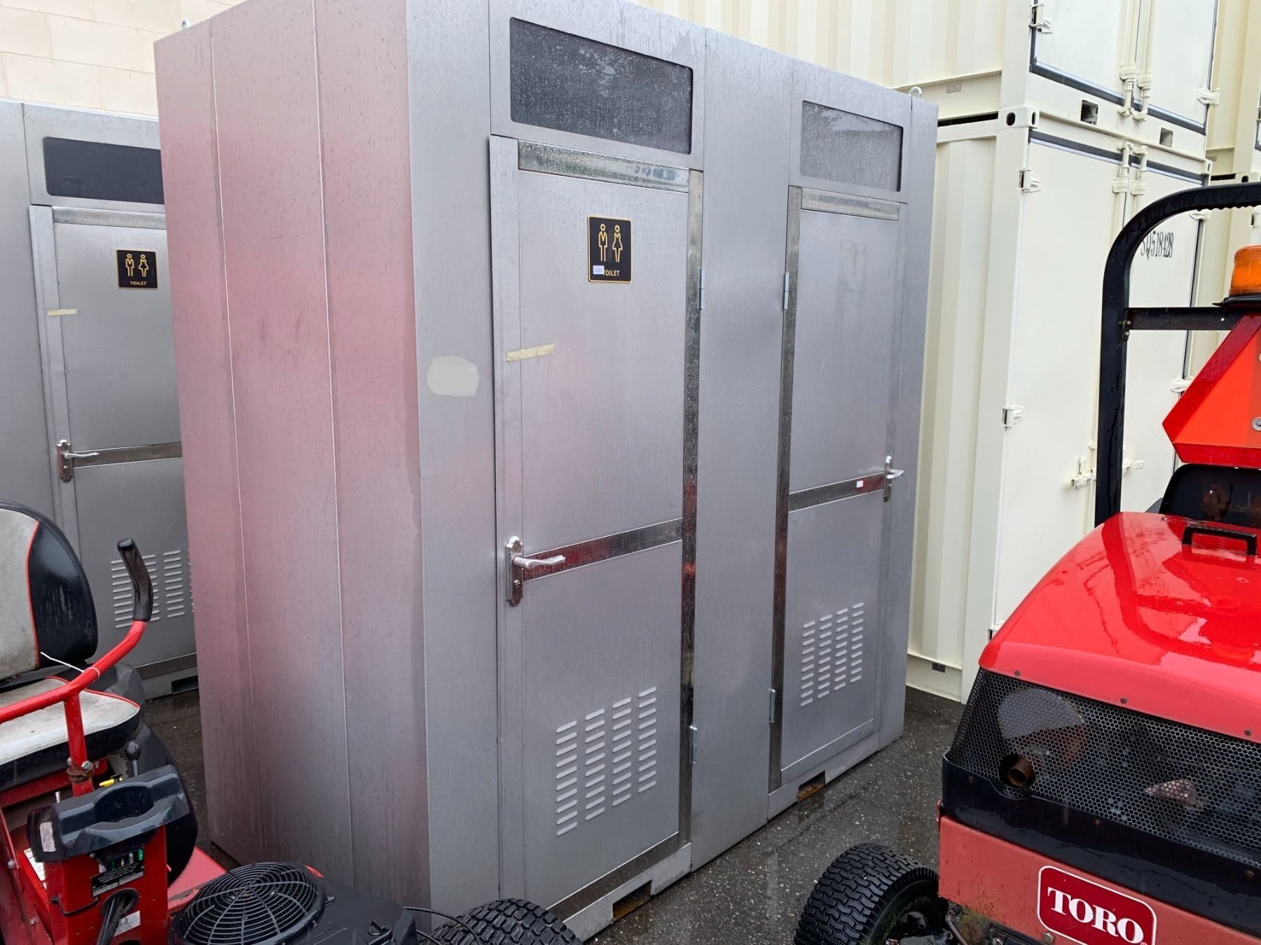 GALVANIZED METAL DUAL PORTABLE WASHROOM WITH 2 TOILETS, SINKS, FANS & LIGHTING