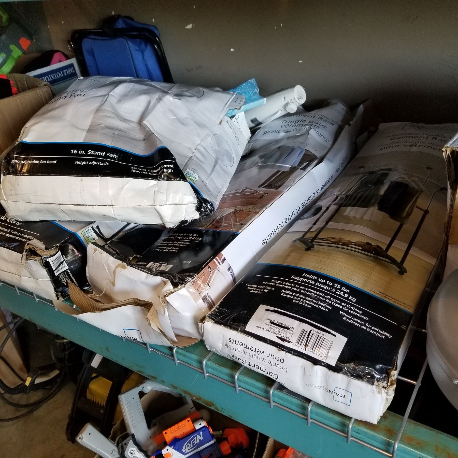 GARMET RACKS AND 2 MAINSTAYS FLOOR FANS