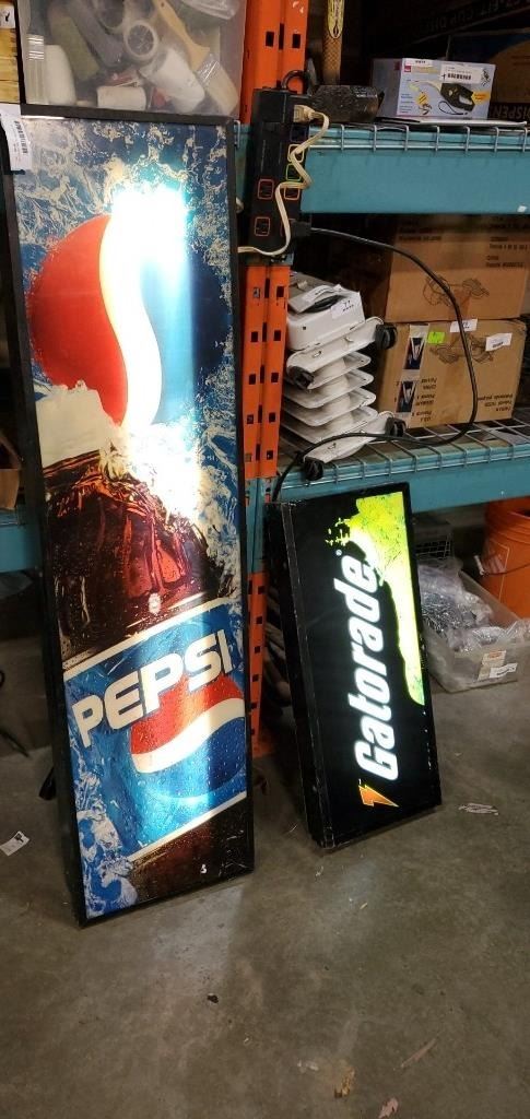 GATORADE AND PEPSI LIGHT UP ADVERTISING SIGNS, PEPSI IS 14" X 53" AND GATORADE IS 12" X 28" BOTH 110 VOLT PLUG