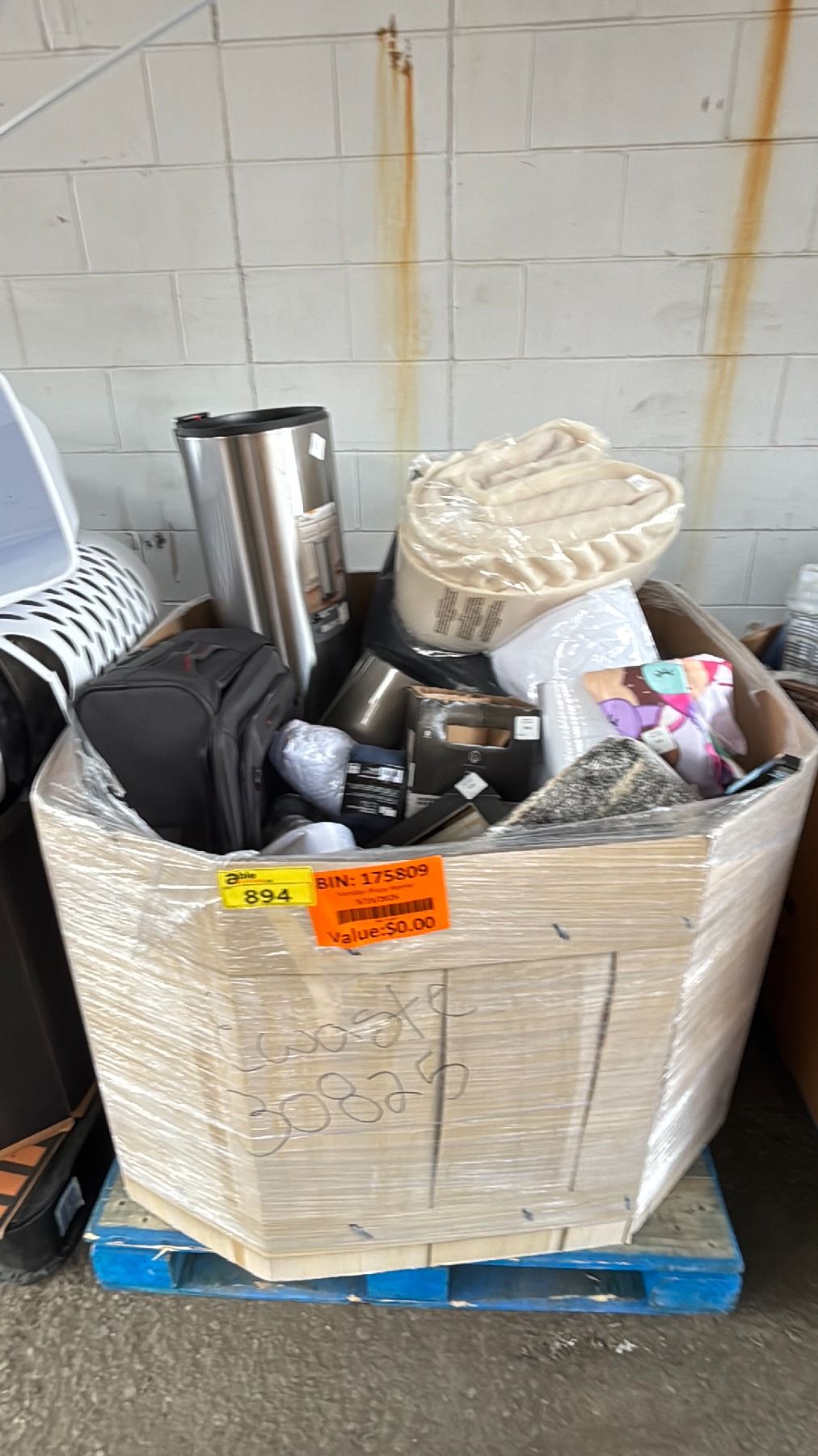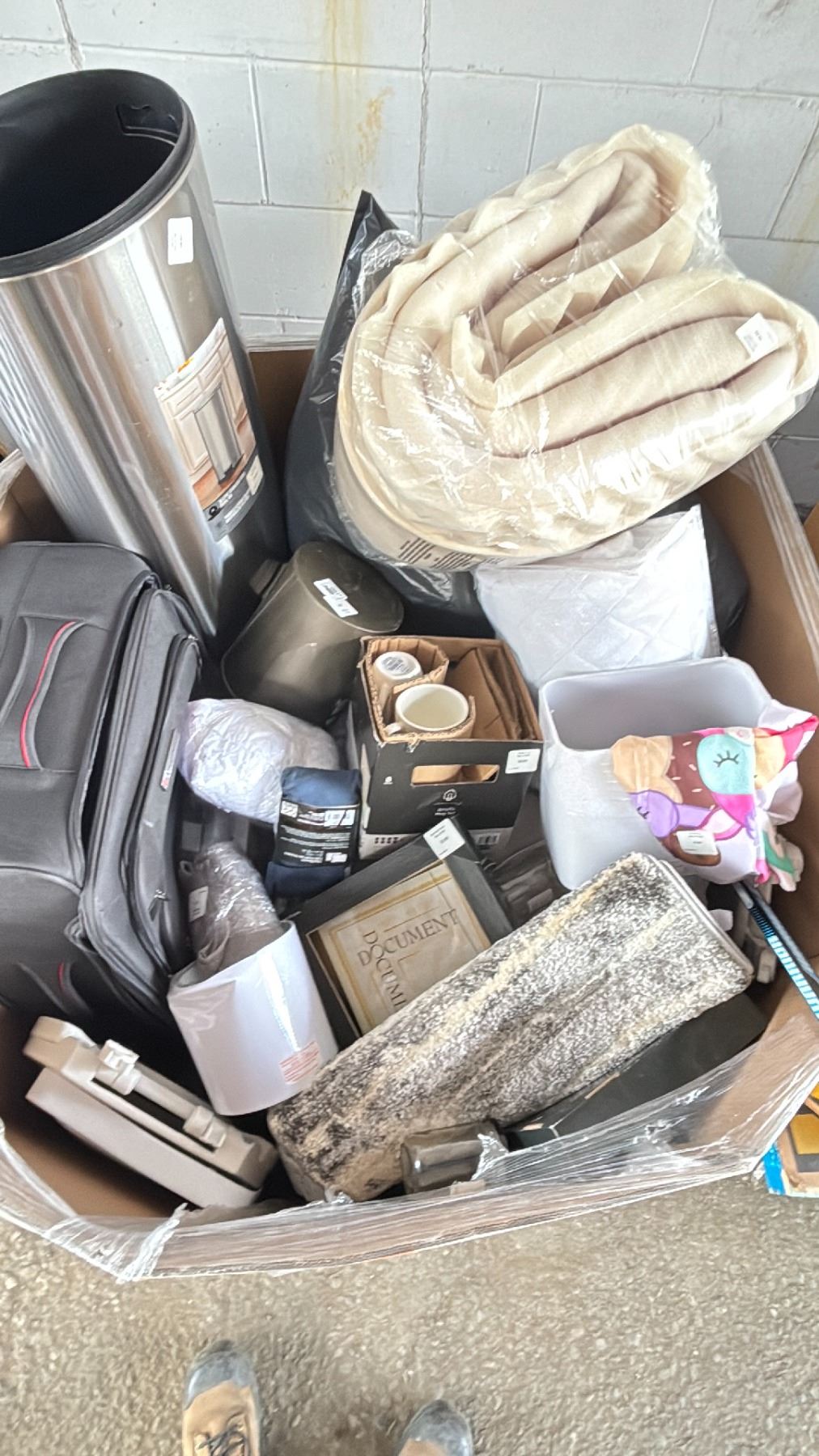 GAYLORD OF ASSORTED ITEMS INCLUDING; BEDDING, WASTE BIN, LUGGAGE & MORE (MAY BE MISSING PARTS & PIECES)