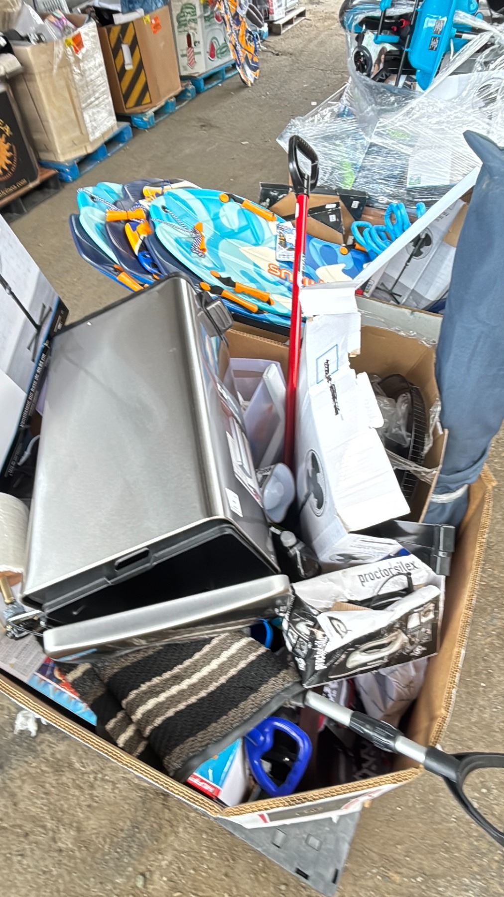 GAYLORD OF ASSORTED ITEMS INCLUDING; FANS, WASTE BIN, IRONING BOARD & MORE (UNKNOWN WORKING CONDITION, MAY BE MISSING PARTS & PIECES)