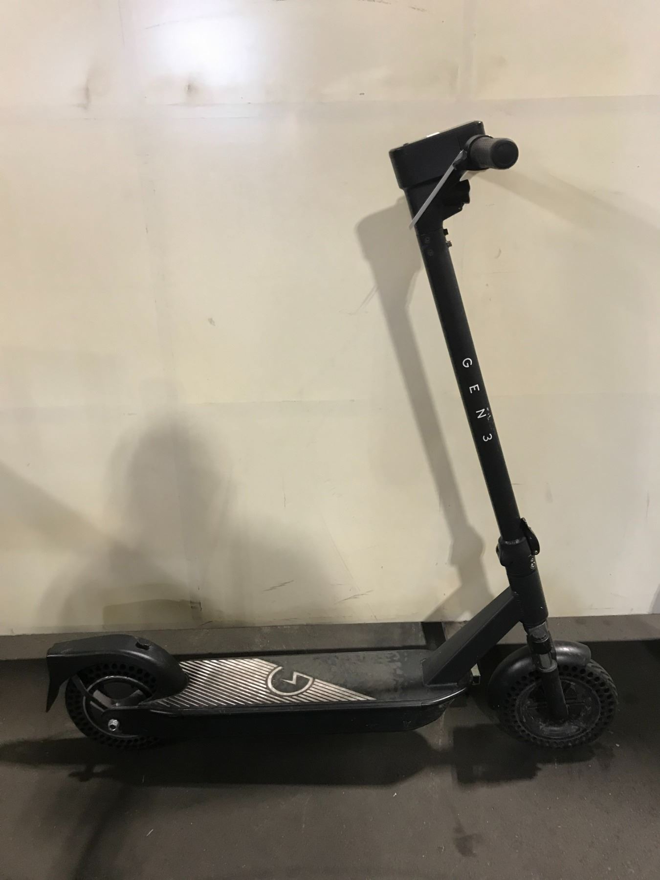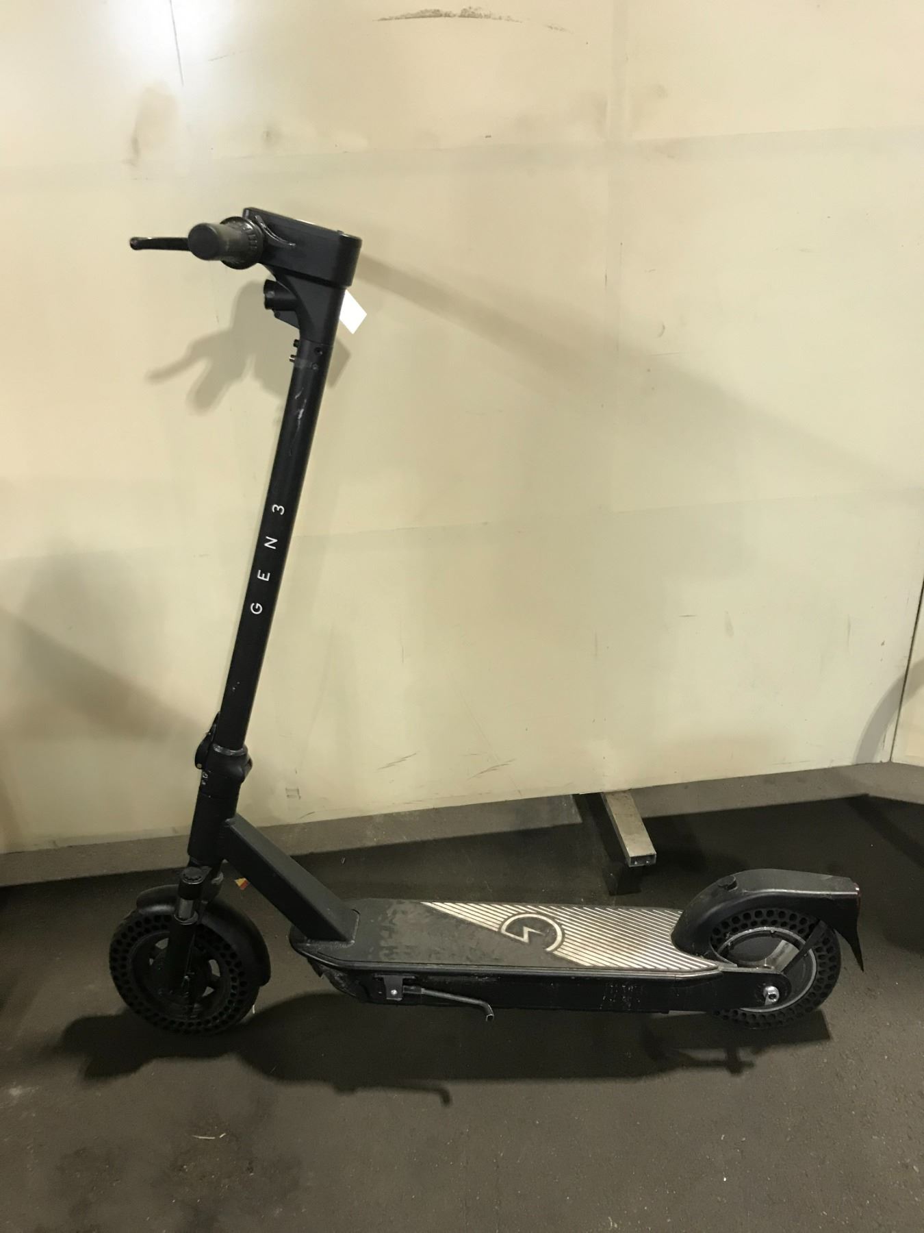 GEN 3 BLACK FRONT SUSPENSION ELECTRIC RIDE ON SCOOTER ( HAS BATTERY, NO CHARGING CABLE, HAS CHARGE, RUNNING )