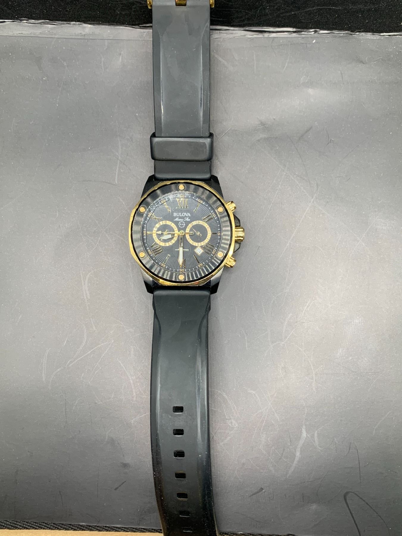 GENTS BULOVA YELLOW GOLD PLATED WRIST WATCH. MARINE STAR ROUND SHAPED CASE, WITH A DIAMETER OF 43 MM. , ACCENTED BY 6 GOLD TONE SMALL CIRCLES BLACK DIAL, MINERAL CRYSTAL AND FEATURES A QUARTZ MOVEMENT WITH APPRAISAL REPLACEMENT VALUE IN AN AS NEW STATE: $ 650.- (SIX HUNDRED AND FIFTY