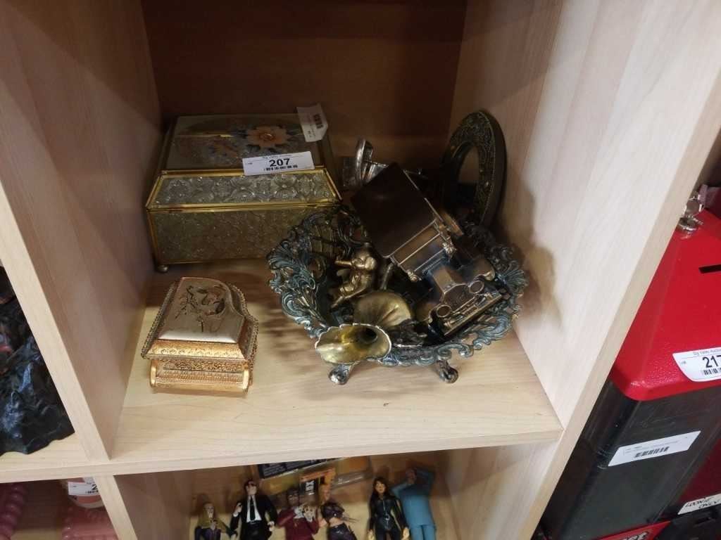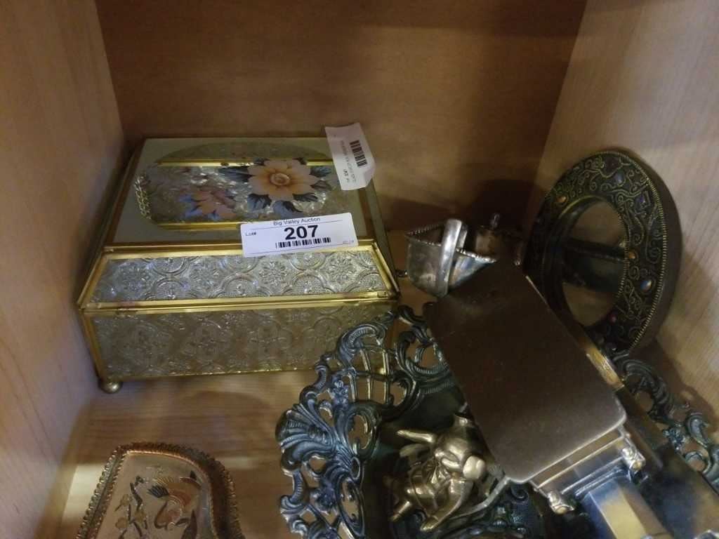 GLASS JEWELRY BOX, DRESSER BOX, MIRROR AND BRASS AND METAL TRAYS AND FIGURES