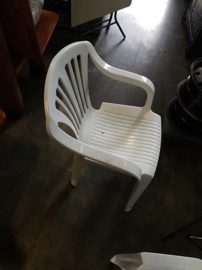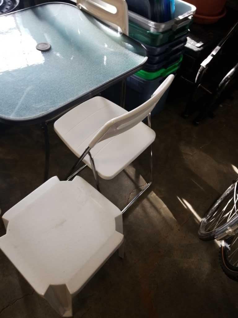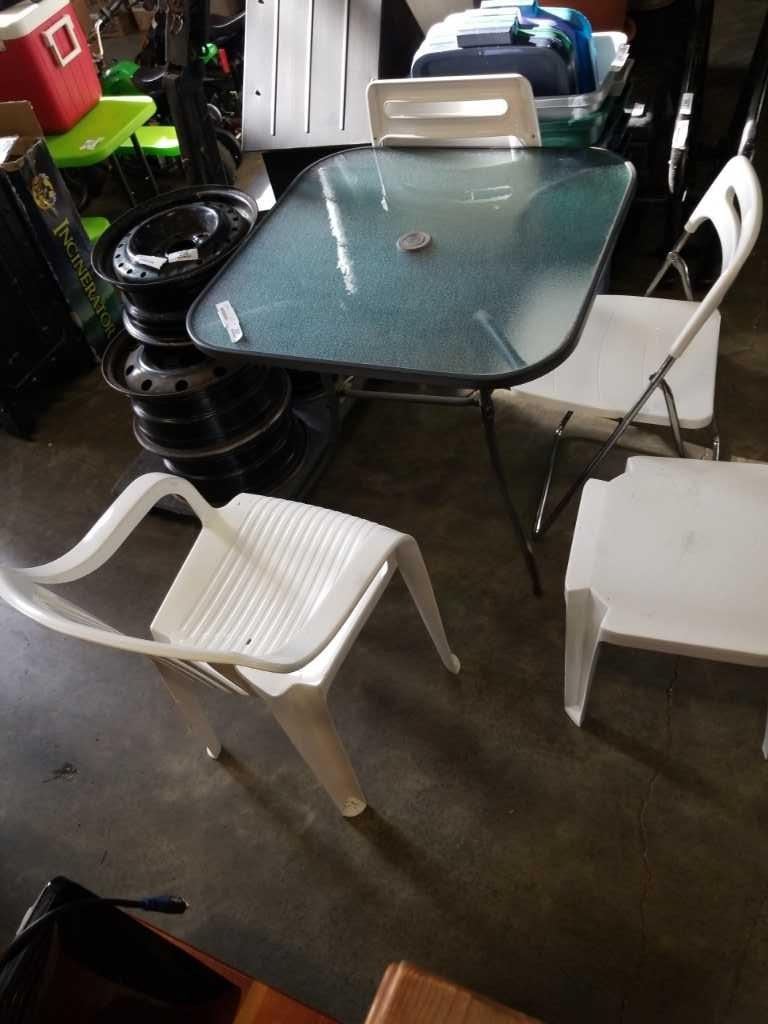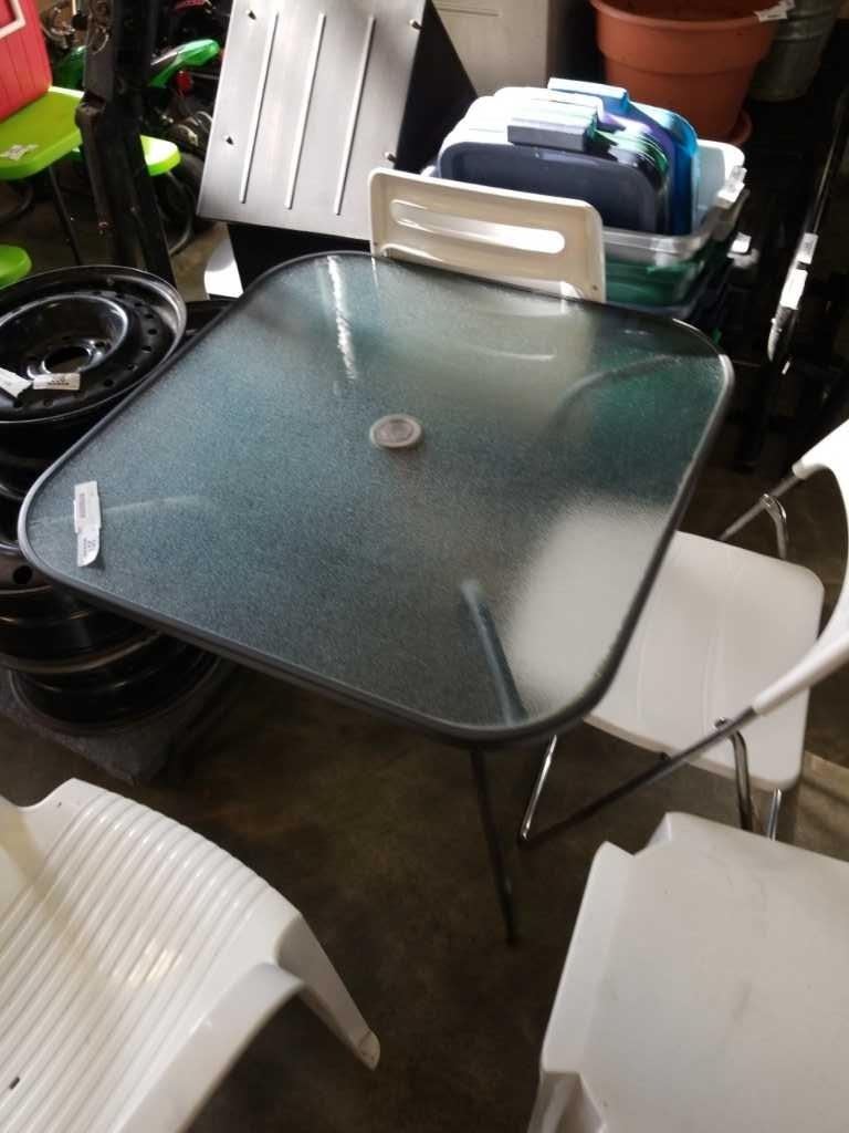 GLASSTOP PATIO TABLE WITH 2 FOLDING CHAIRS, PLASTIC ARMCHAIR AND SIDE TABLE