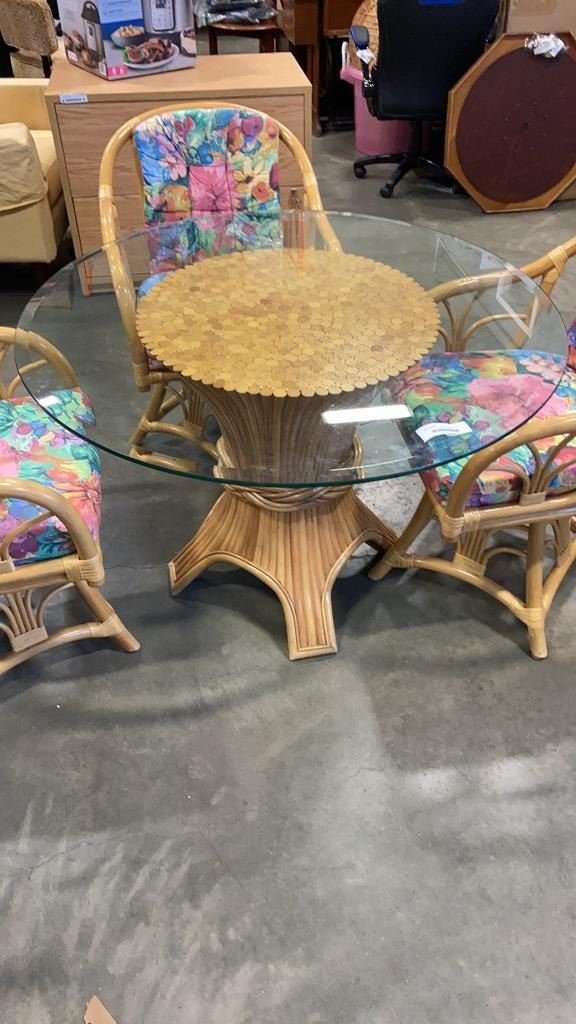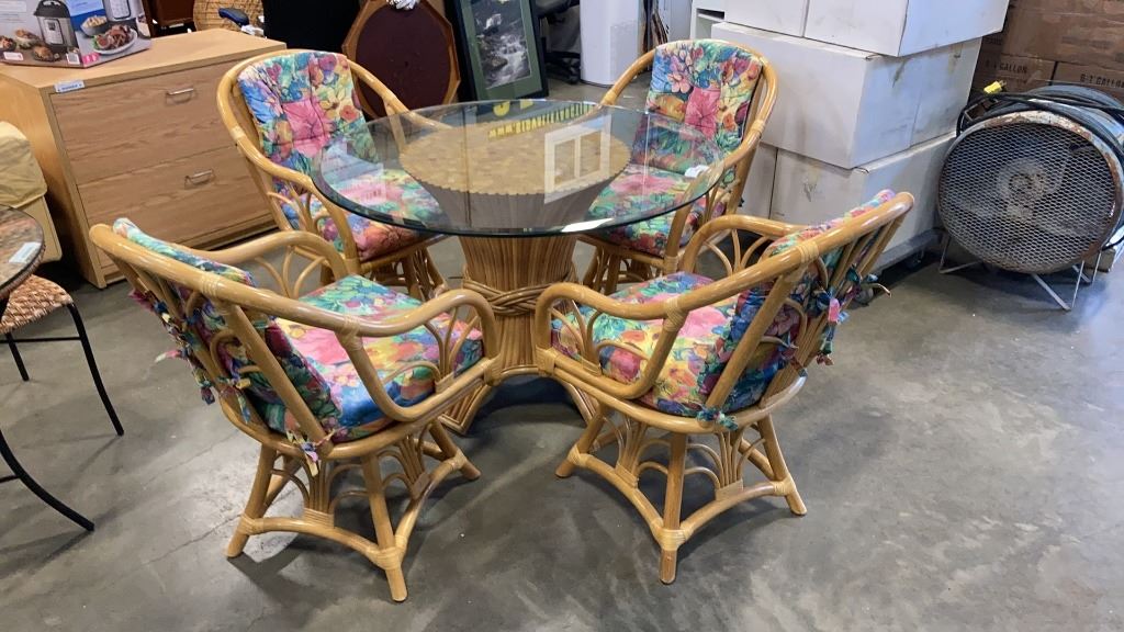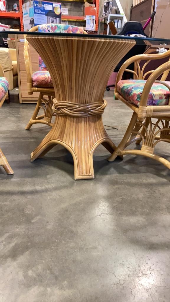GLASSTOP RATTAN DINING TABLE WITH 4 CHAIRS