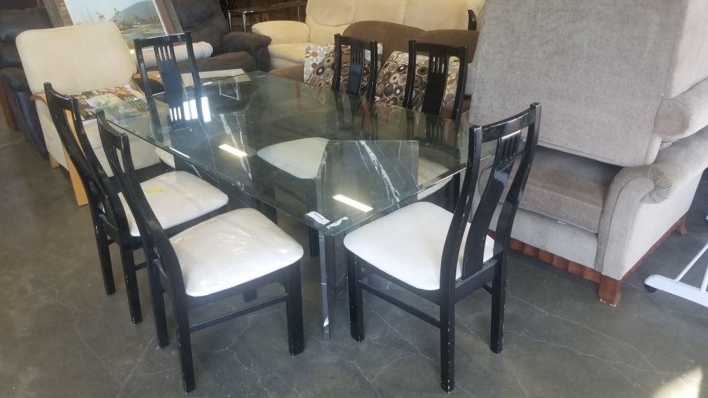 GLASSTOP STONE BASE DINING TABLE WITH 6 BLACK DINING CHAIRS WITH WHITE CUSHIONS - 42 X 72 INCHES X 3