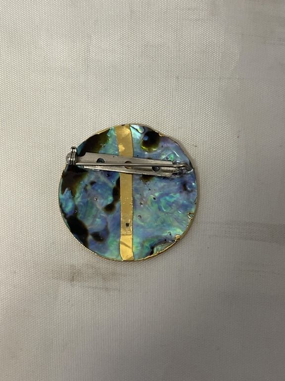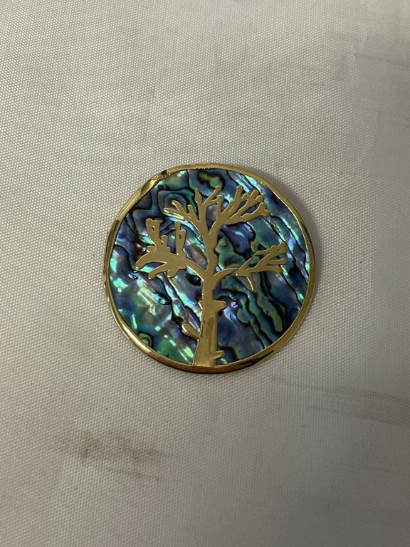 GOLD COLOUR LIFE TREE O ABELONE SHELL FRAMED BROOCH 1 1/3" DIAMETER