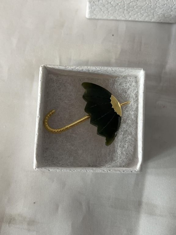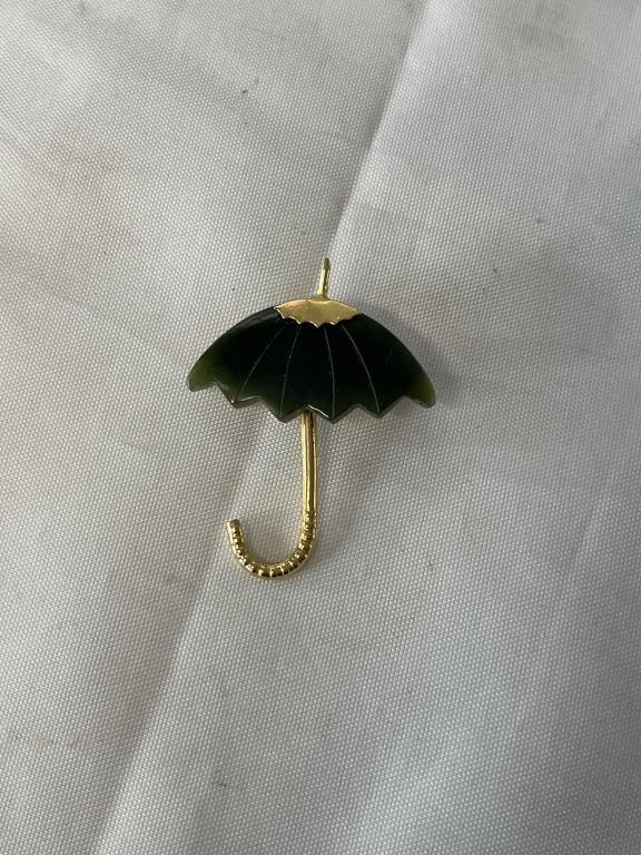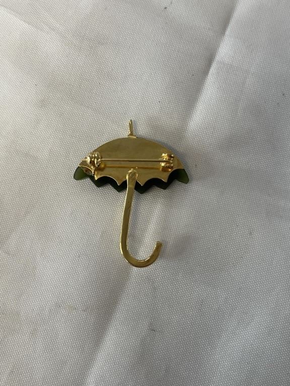 GOLD COLOURED DARK GREEN BC JADE STONE HAND CARVED UMBRELLA BROOCH