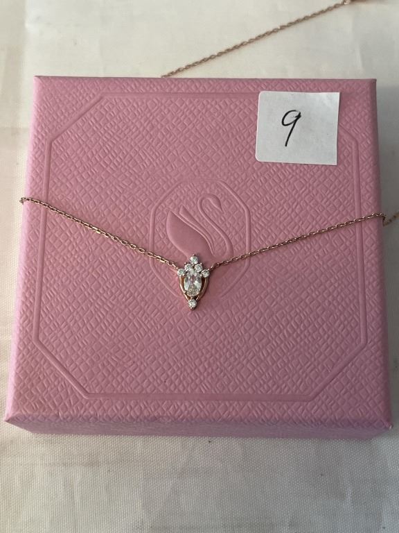 GOLD GUILDED STERLING SILVER SWAROVSKI CRYSTAL STONES NECKLACE, MARKED 925 SWAN ETC W/ ORIGINAL BOX