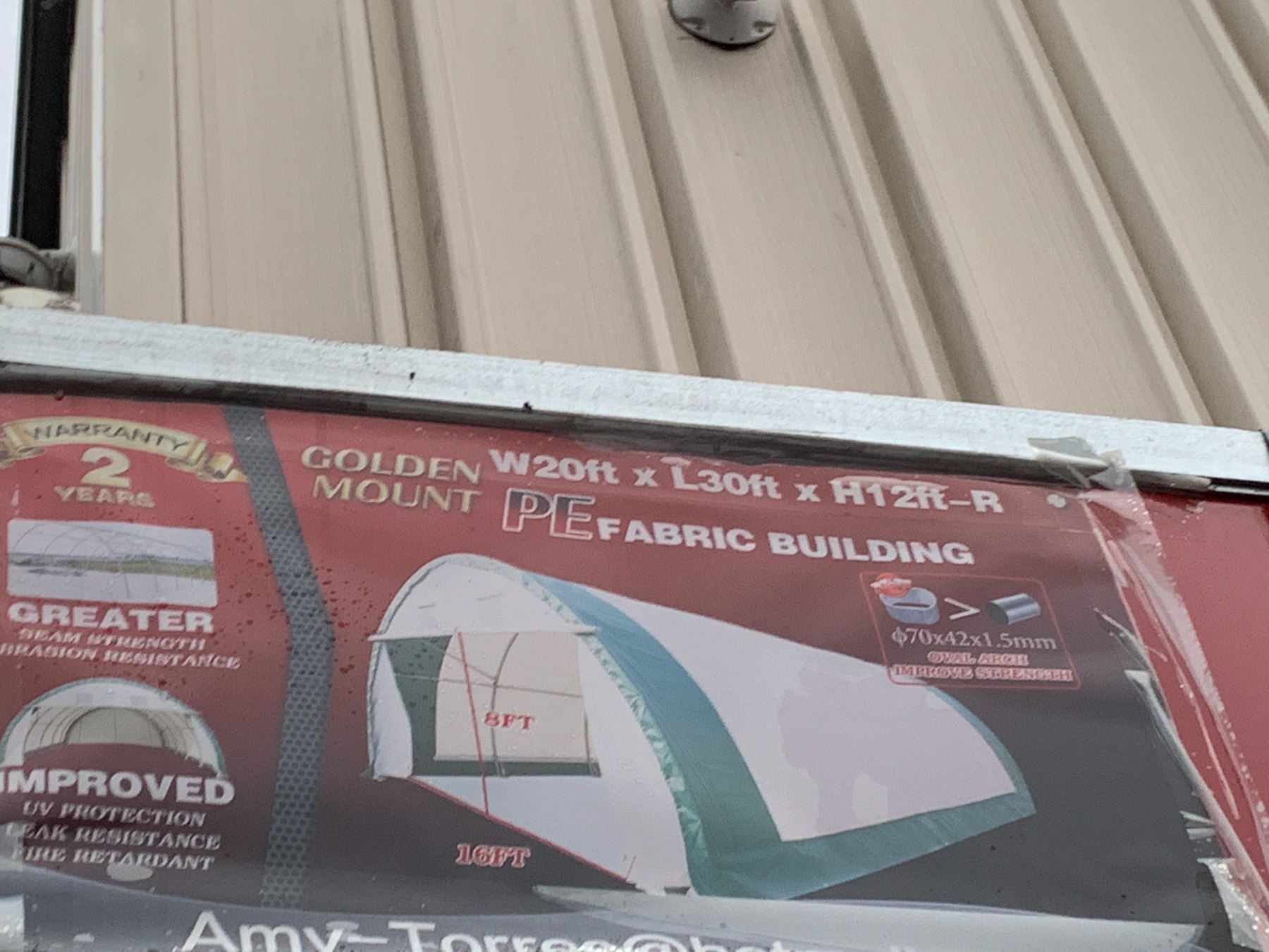 GOLDEN MOUNT 20' X 30' X 12' HIGH ROUND ROOF PE FABRIC BUILDING WITH 16' X 8' ROLL DOOR