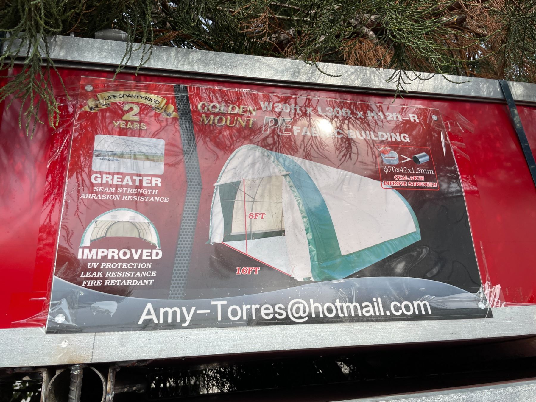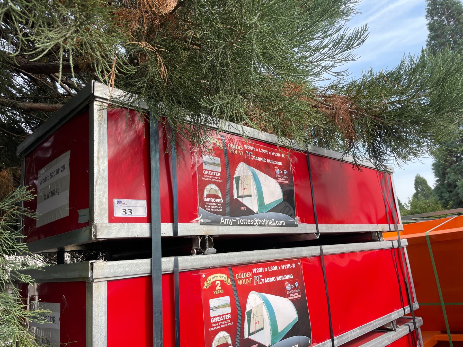 GOLDEN MOUNT PE FABRIC BUILDING H12' X L30' X W20' UV PROTECTION, LEAK RESISTANT, FIRE RETARDANT AND GREATER SEAM STRENGTH ABRASION RESISTANCE WITH 8' X 16'' ROLL UP DOOR APPROX WEIGHT 360KG
