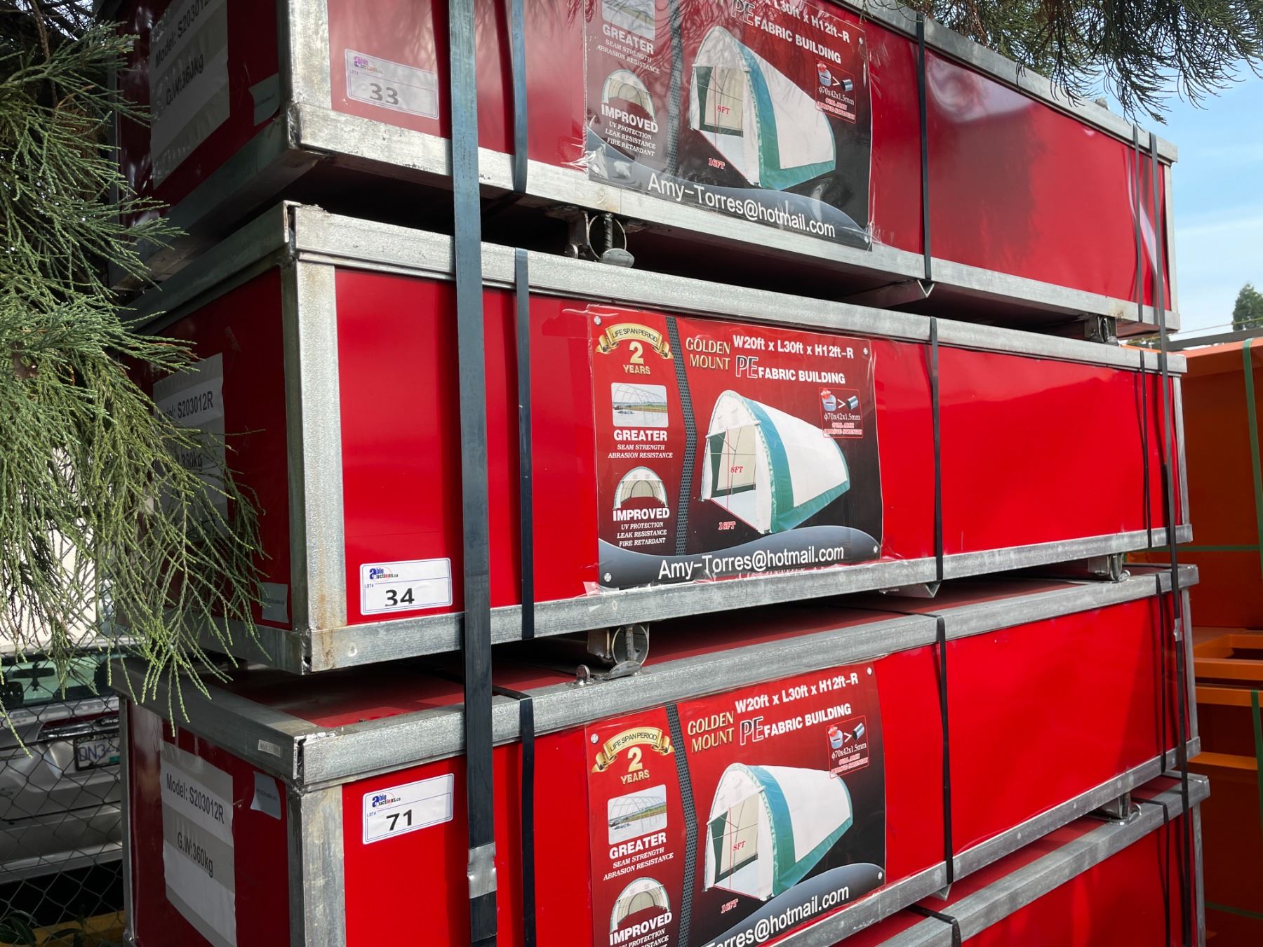 GOLDEN MOUNT PE FABRIC BUILDING H12' X L30' X W20' UV PROTECTION, LEAK RESISTANT, FIRE RETARDANT AND GREATER SEAM STRENGTH ABRASION RESISTANCE WITH 8' X 16'' ROLL UP DOOR APPROX WEIGHT 360KG