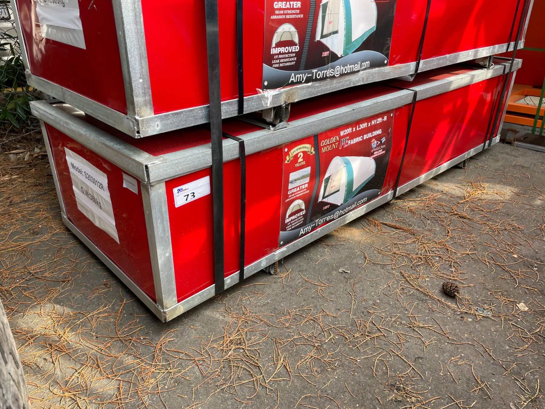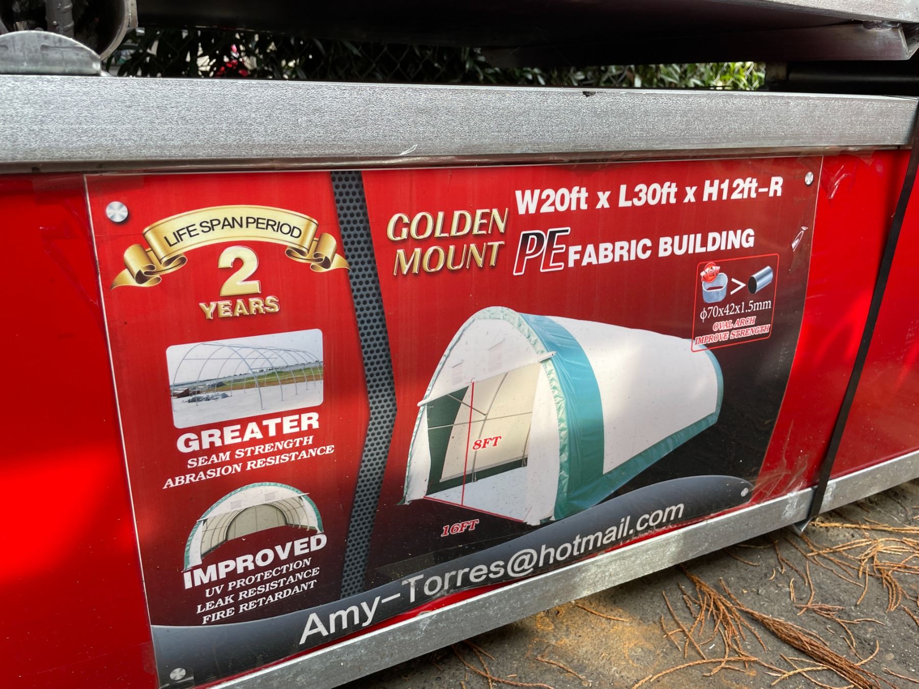 GOLDEN MOUNT PE FABRIC BUILDING H12' X L30' X W20' UV PROTECTION, LEAK RESISTANT, FIRE RETARDANT AND GREATER SEAM STRENGTH ABRASION RESISTANCE WITH 8' X 16'' ROLL UP DOOR APPROX WEIGHT 360KG