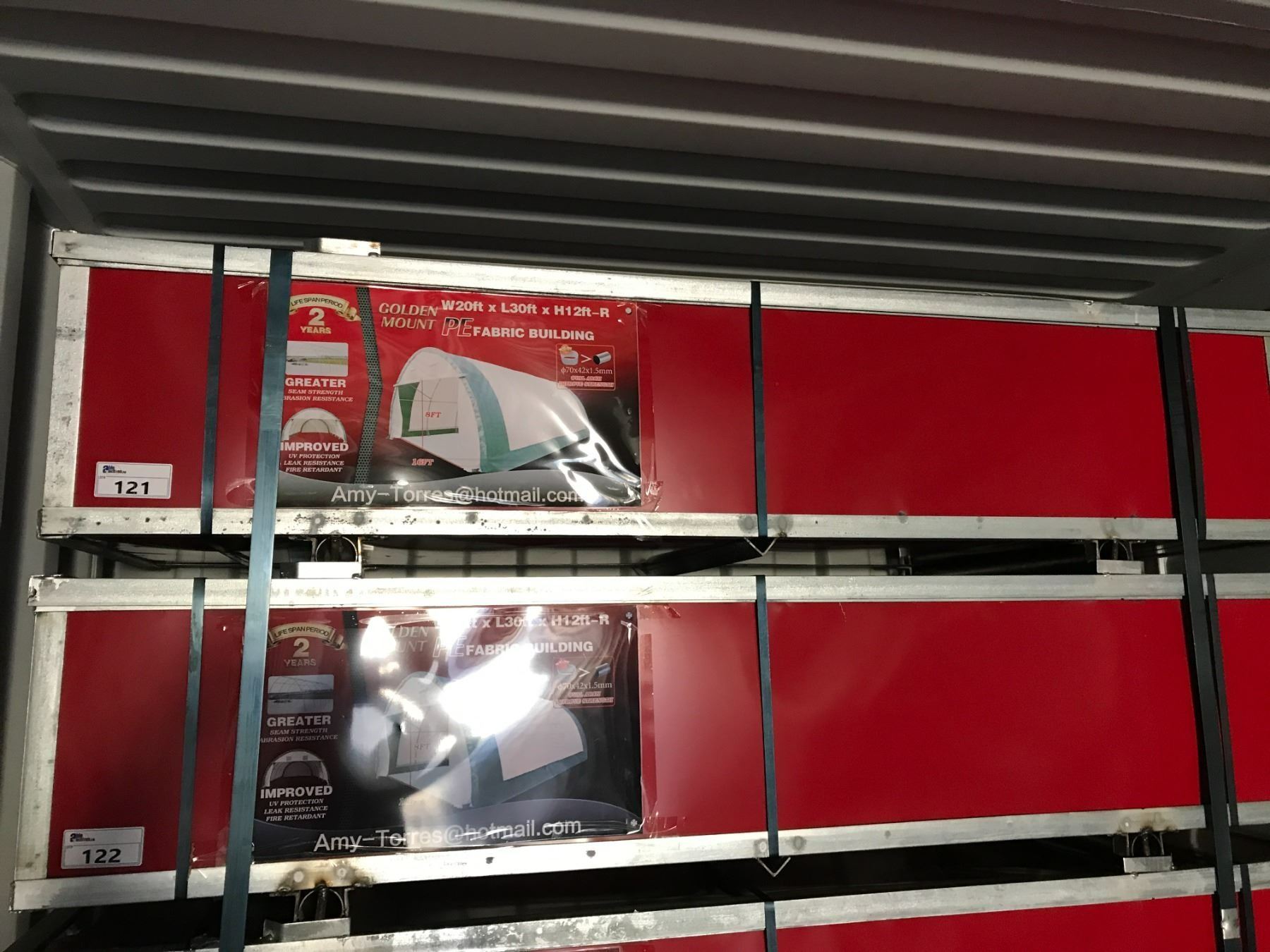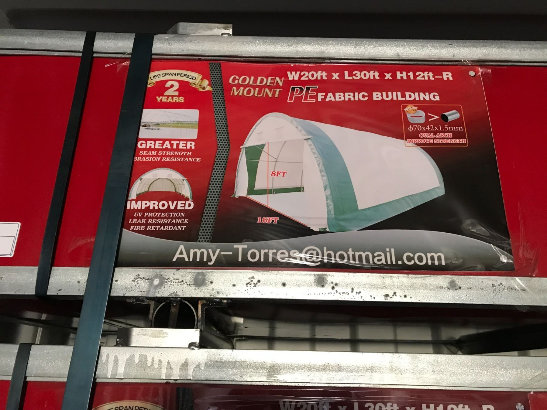 GOLDEN MOUNT PE FABRIC BUILDING H12' X L30' X W20' UV PROTECTION, LEAK RESISTANT, FIRE RETARDANT & GREATER SEAM STRENGTH ABRASION RESISTANCE WITH 8' X 16' ROLL UP DOOR CRATE SIZE - 87"W X 30"D X 18"H, GROSS WEIGHT 360KG