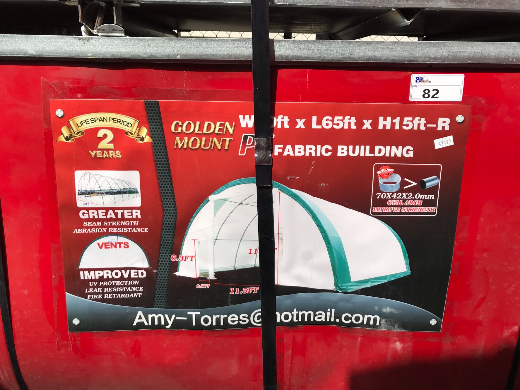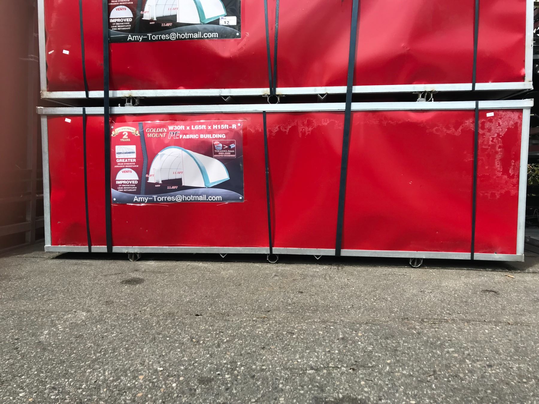 GOLDEN MOUNT PE FABRIC BUILDING H15' X L65' X W30' UV PROTECTION, LEAK RESISTANT, FIRE RETARDANT AND GREATER SEAM STRENGTH ABRASION RESISTANCE WITH 11.5' X 11.5' ROLL UP DOOR AND 6.3' MAN DOOR APPROX WEIGHT 1120KG