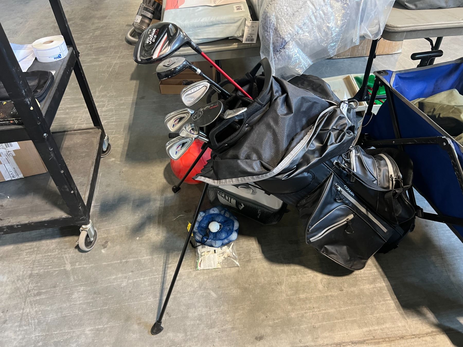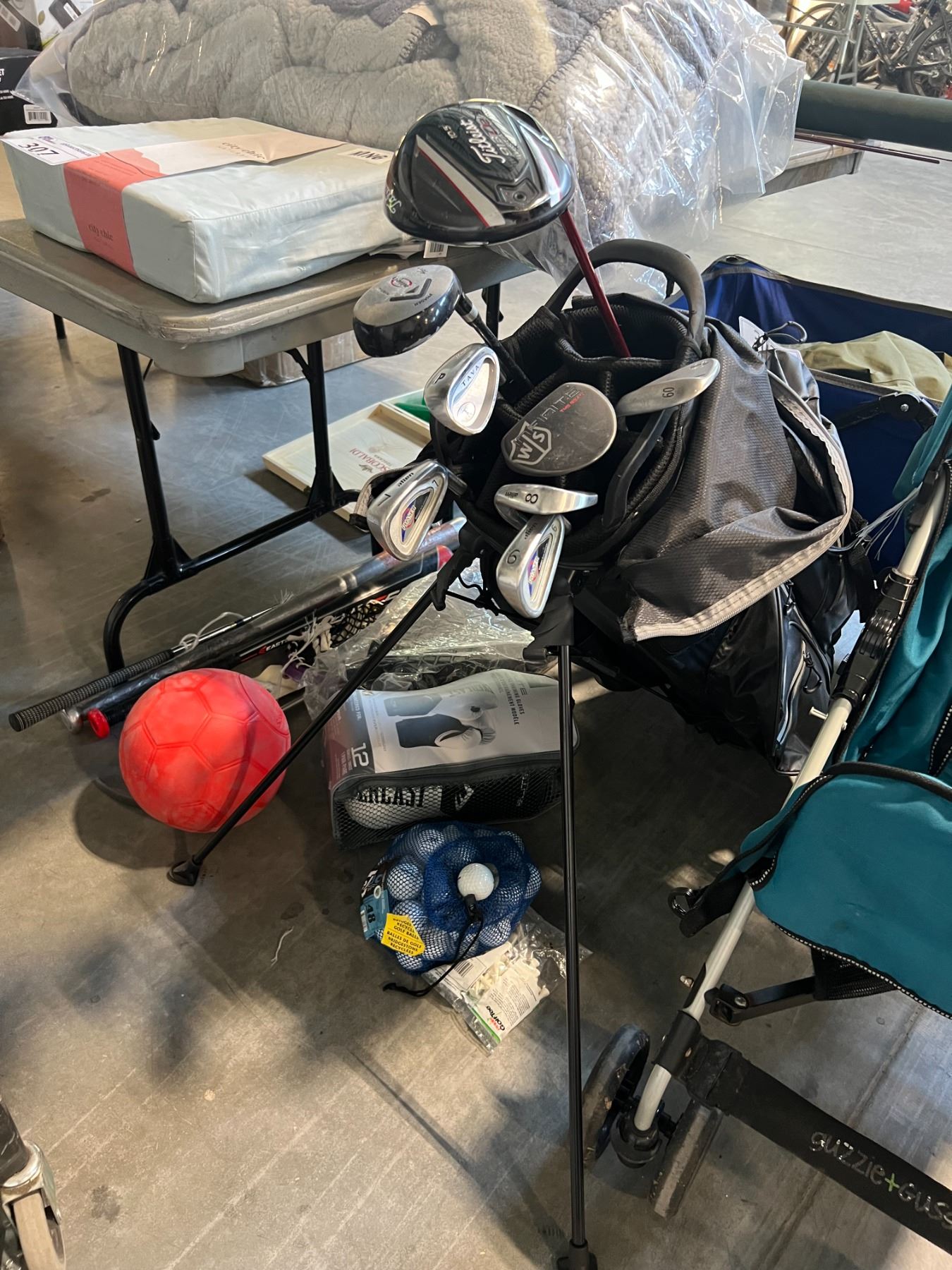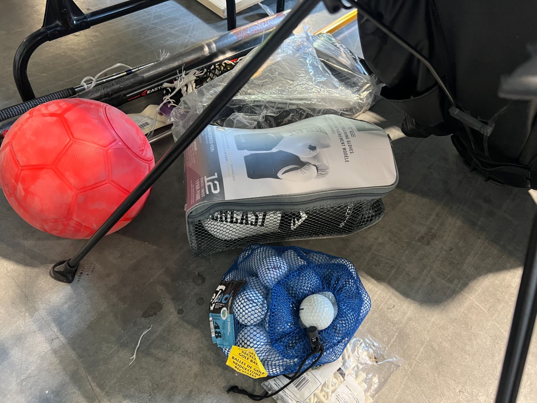 GOLF BAG WITH BALLS, EVERLAST TRAINING GLOVES, AND ASSORTED SPORTING GOODS