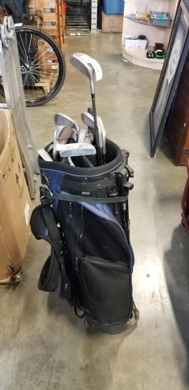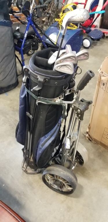 GOLF BAG WITH LEFT HAND CLUBS AND CART