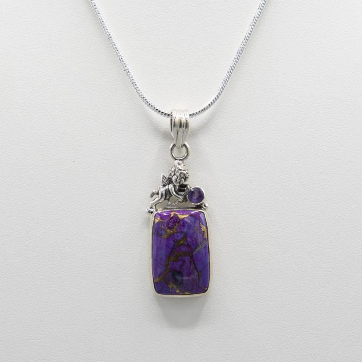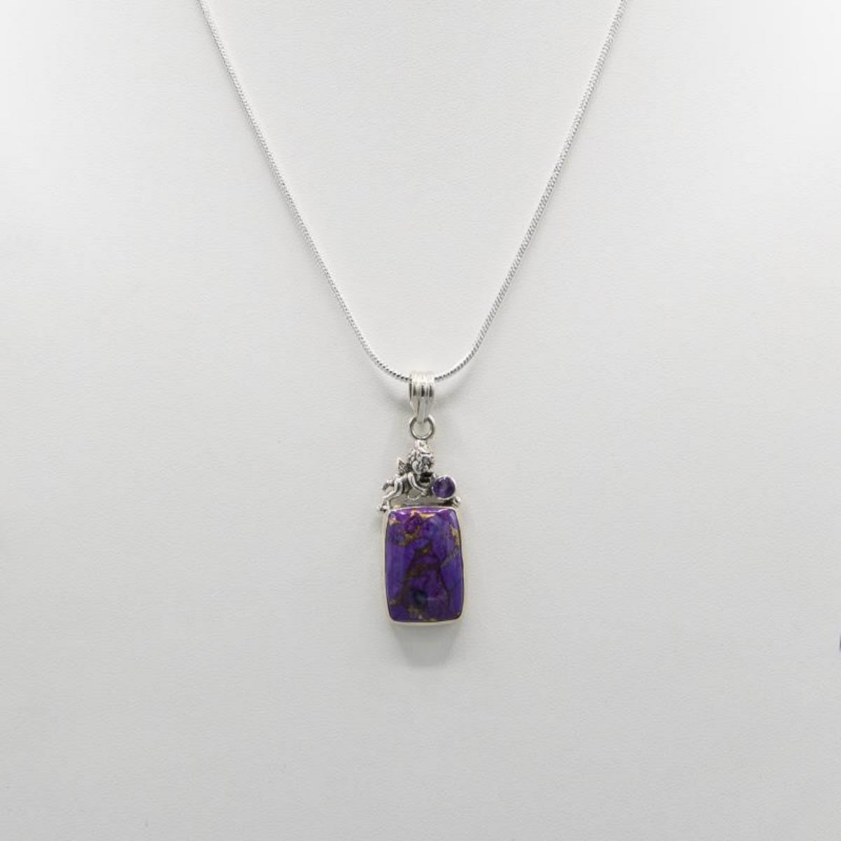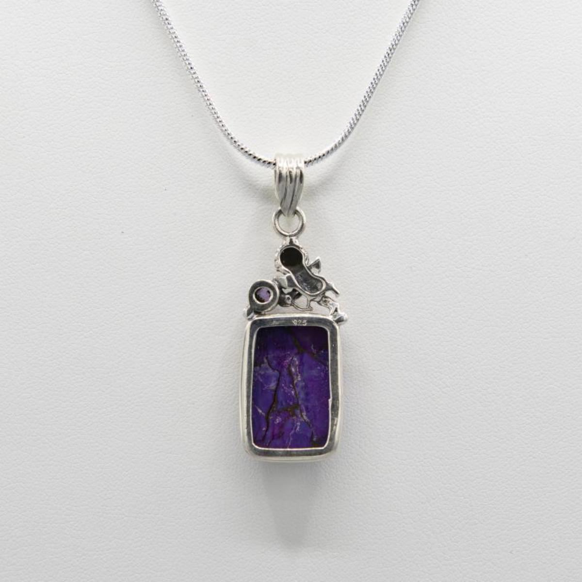 GORGEOUS 11 CT NATURAL ARIZONA LAVENDER TURQUOISE AND COPPER HIGHLIGHTS PENDANT . MOUNTED IN SOLID .925 STERLING SILVER WITH A 1.75 CT AMETHYST ACCENT STONE. INCLUDES 20 " 2 MM CHAIN. VERY UNIQUE.74 CTTW OR 17.8 TOTAL GRAM WEIGHT