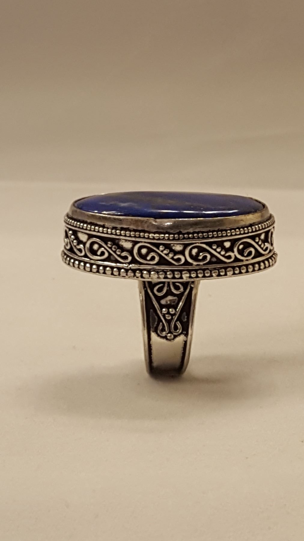 GORGEOUS 16.75 CT BLUE LAPIS LAZULI RING. MOUNTED IN ELABORATELY DESIGNED .925 SILVER SETTING. APPROXIMATE SIZE 7. HUGE 81.50 CTTW