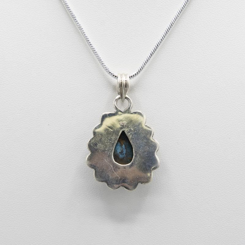 GORGEOUS 3.25 CT NATURAL ARIZONA BLUE TURQUOISE PENDANT. COMPLIMENTED WITH COPPER HIGHLIGHTS. MOUNTED IN ELABOTRATELY DESIGNED SOLID .925 STERLING SILVER. INCLUDES 20 " LONG 2 MM CHAIN. 76 CTTW OR 14 GRAMS TOTAL GRAM WEIGHT. ABSOLUTELY STUNNING.