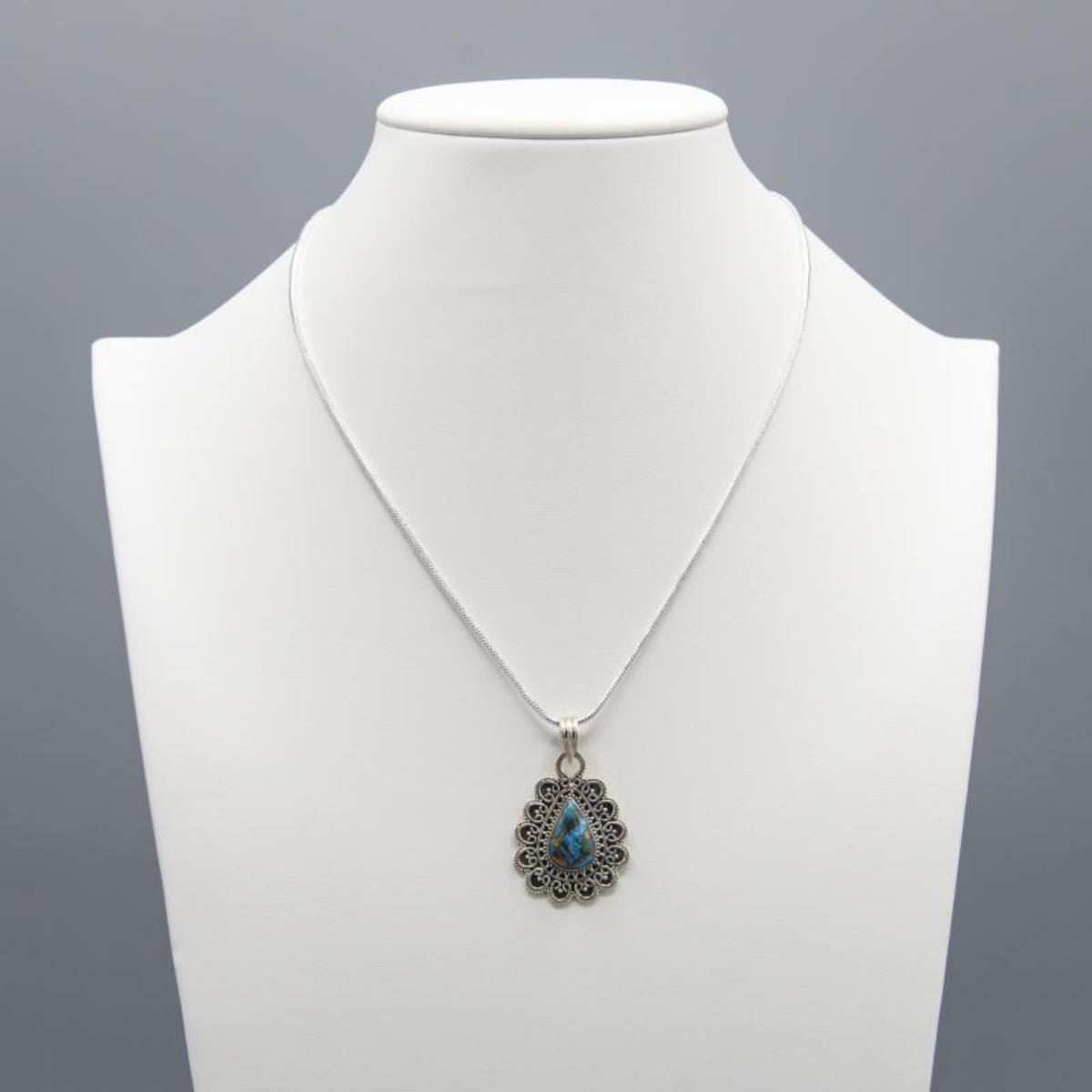 GORGEOUS 3.25 CT NATURAL ARIZONA BLUE TURQUOISE PENDANT. COMPLIMENTED WITH COPPER HIGHLIGHTS. MOUNTED IN ELABOTRATELY DESIGNED SOLID .925 STERLING SILVER. INCLUDES 20 " LONG 2 MM CHAIN. 76 CTTW OR 14 GRAMS TOTAL GRAM WEIGHT. ABSOLUTELY STUNNING.
