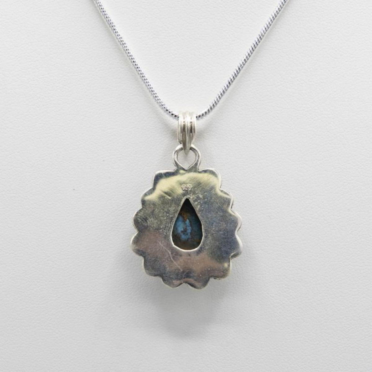 GORGEOUS 3.25 CT NATURAL ARIZONA BLUE TURQUOISE PENDANT. COMPLIMENTED WITH COPPER HIGHLIGHTS. MOUNTED IN ELABOTRATELY DESIGNED SOLID .925 STERLING SILVER. INCLUDES 20 " LONG 2 MM CHAIN. 76 CTTW OR 14 GRAMS TOTAL GRAM WEIGHT. ABSOLUTELY STUNNING.