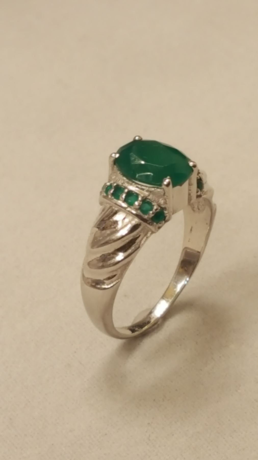 GORGEOUS 3.5 CT NATURAL EMERALD RING. MOUNTED IN ELABORATELY DESIGNED SOLID .925 STERLING SILVER COMPLIMENTED BY 12 EMERALD ACCENT STONES. SIZE 7 1/2 . TOTAL GRAM WT ID 3.9