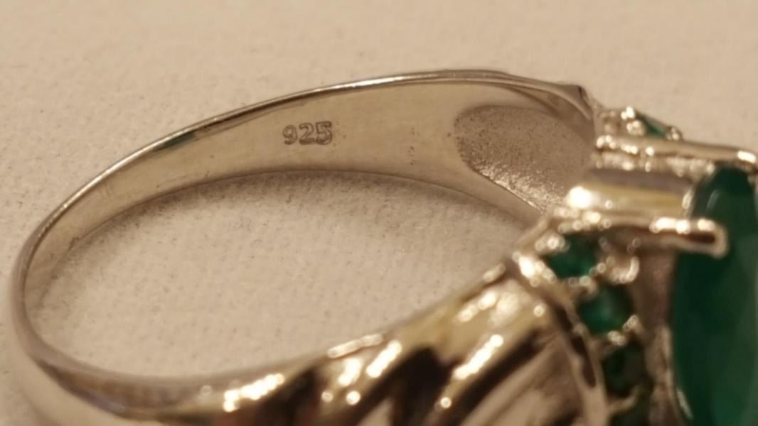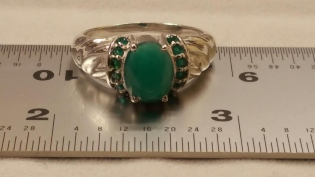 GORGEOUS 3.5 CT NATURAL EMERALD RING. MOUNTED IN ELABORATELY DESIGNED SOLID .925 STERLING SILVER COMPLIMENTED BY 12 EMERALD ACCENT STONES. SIZE 7 1/2 . TOTAL GRAM WT ID 3.9