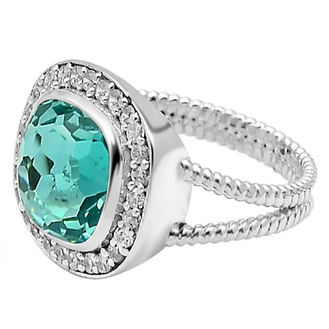 GORGEOUS 4.5 CT PARAIBA TOURMALINE RING. THIS LAB CREATED PARAIBA IS EYE CLEANMOUNTED IN SOLID .925 STERLING SILVER. CUSHION CUT. SIZE 8 1/2 . GRAM TOTAL WT IS 5.3 GRAMS