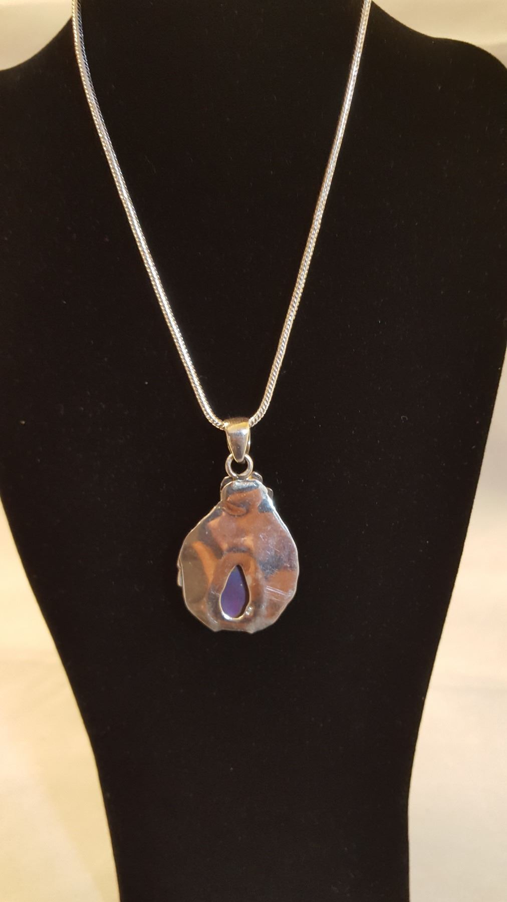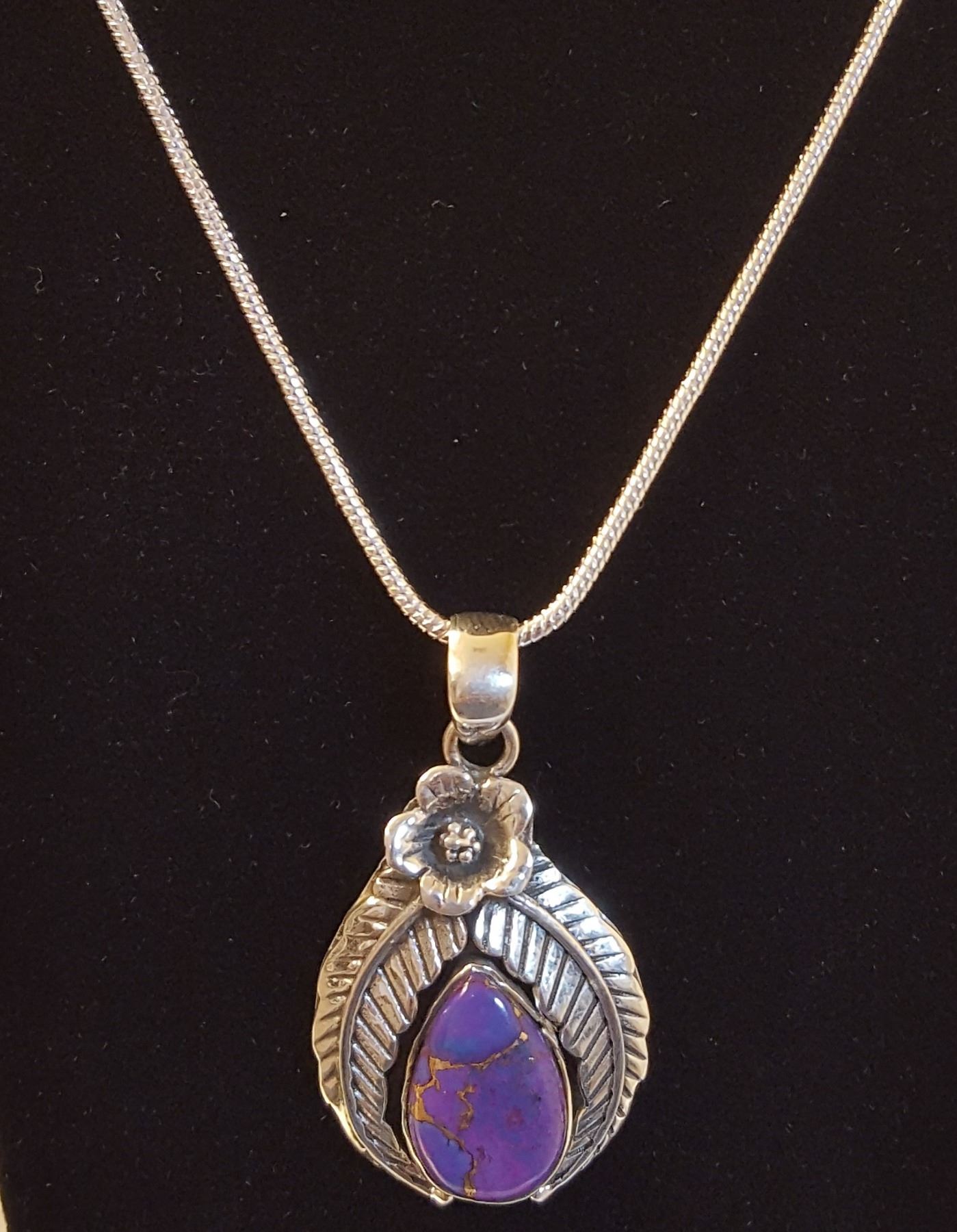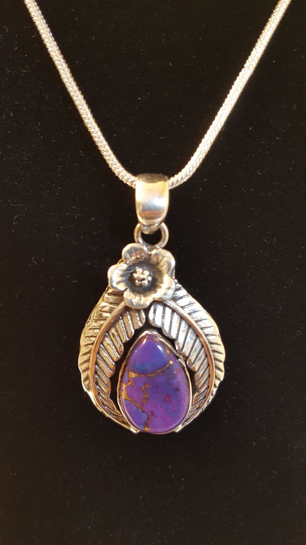 GORGEOUS 7.75 CT NATURAL ARIZONA LAVENDER TURQUOISE AND COPPER HIGHLIGHTS PENDANT . MOUNTED IN SOLID .925 STERLING SILVER. INCLUDES 20 " 2 MM CHAIN. VERY UNIQUE SILVER SETTING. 80.50 CTTW