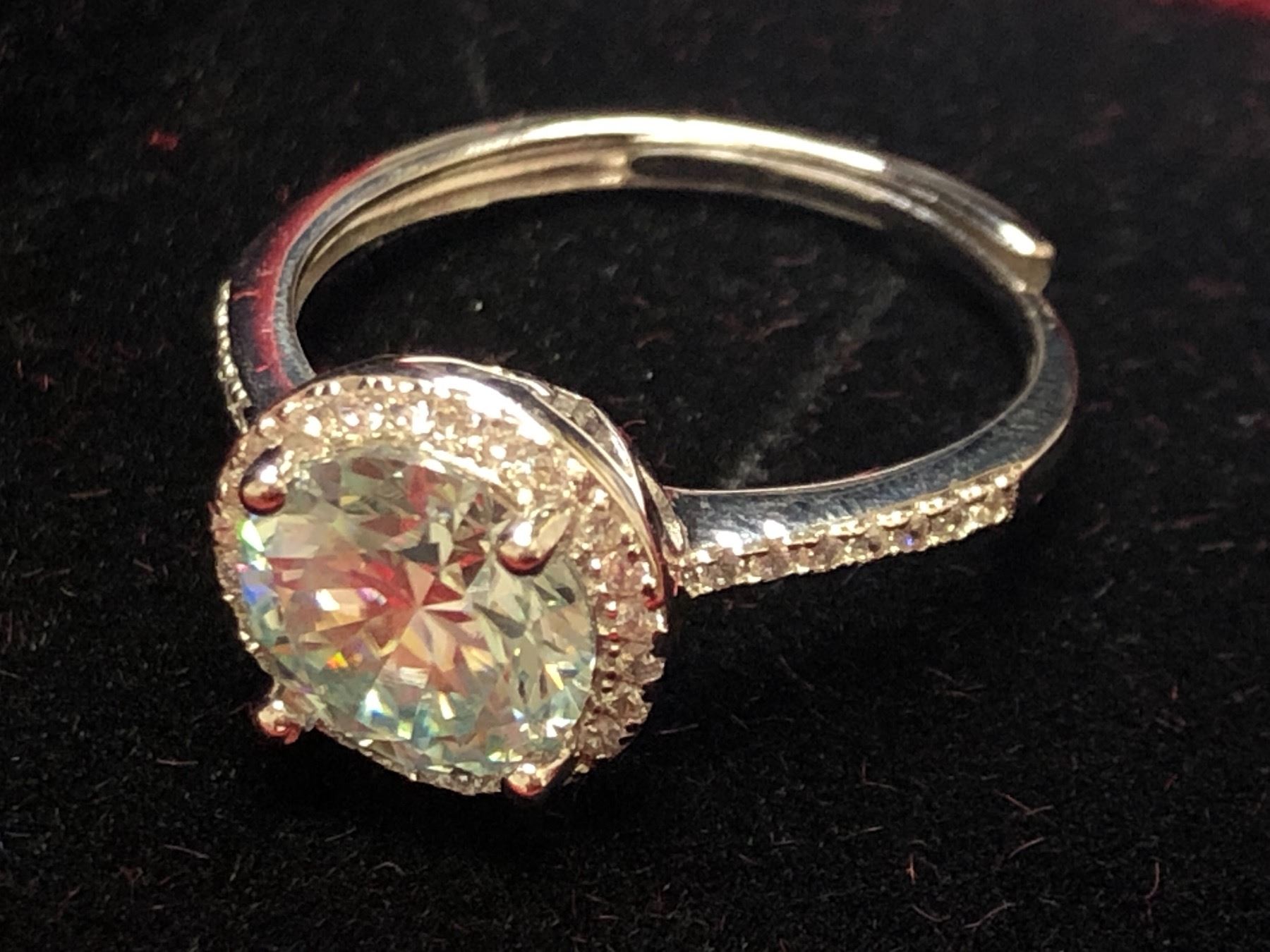 GRA CERTIFIED RING WITH 2.00 CARAT MOISSANITE VVS D COLORED MOISSANITE SET IN 925 SILVER WITH 35 CUBIC ZIRCONIUM IN HALO AND WITH MORE IN SHANK OF RING. RING SIZE 7 APPRAISED VALUE $2,100.00